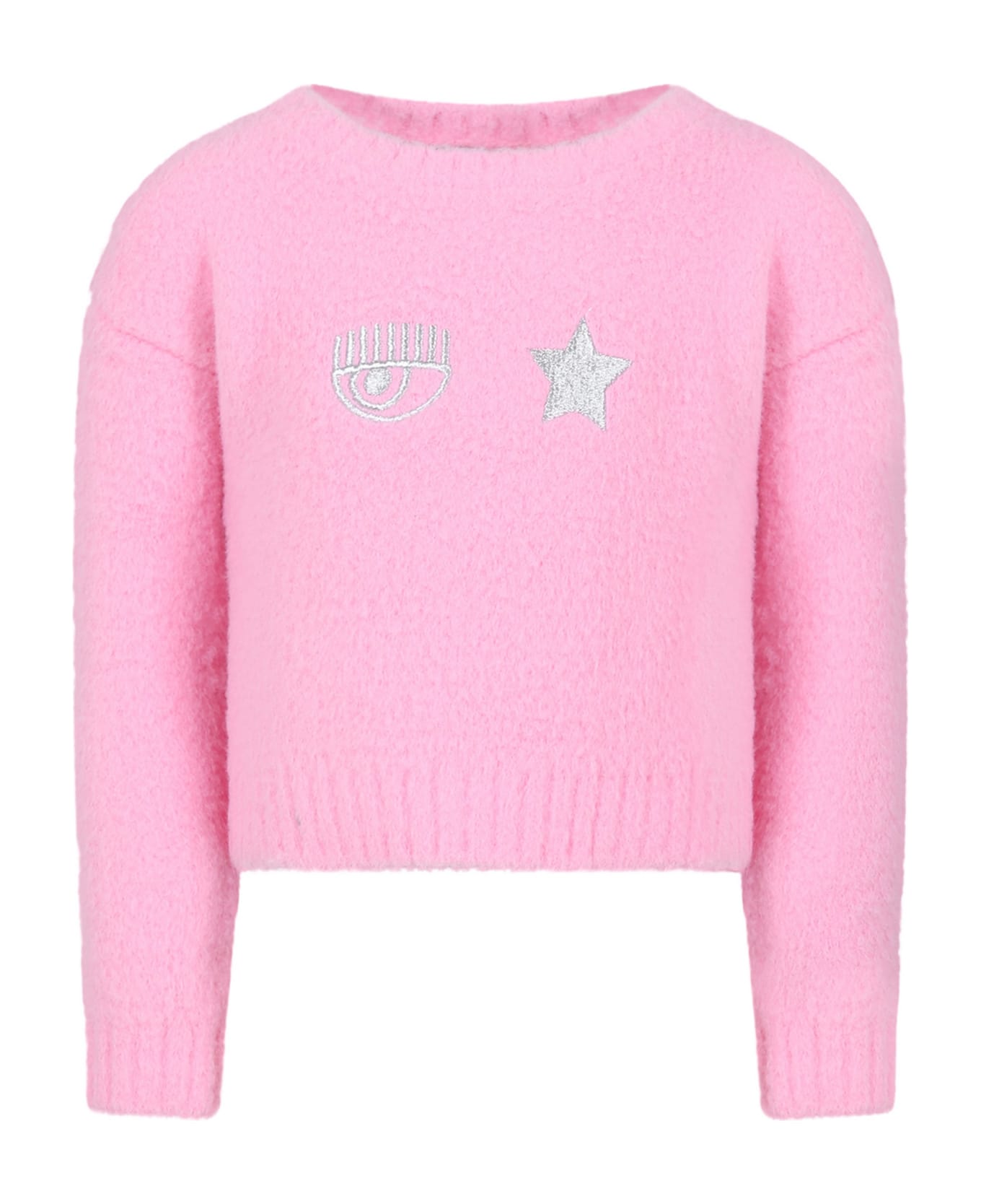 Pink sweater, teddy effect, with long sleeves, crew neck. It is embellished with eyestar embroidered on the front.