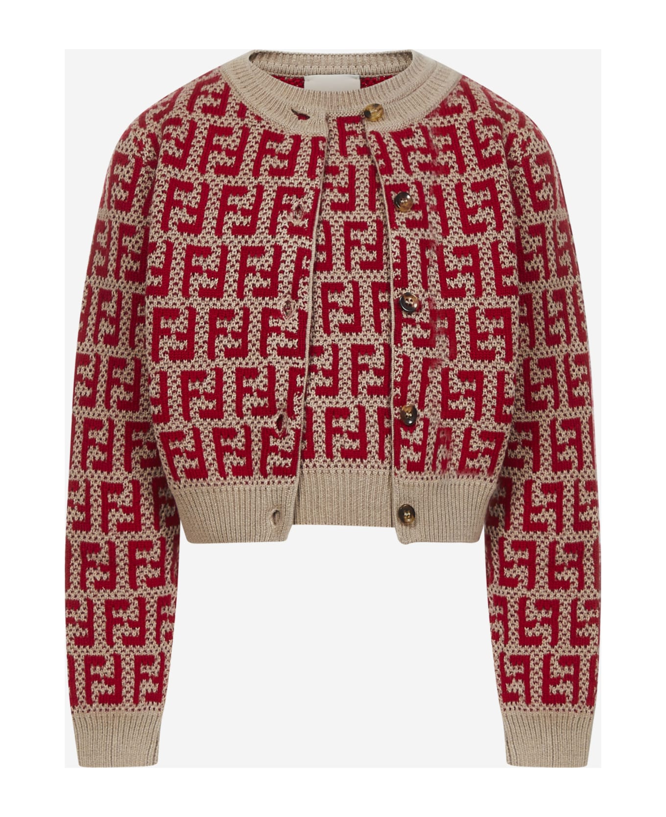 Cardigan: Front buttons closure; Ribbed crewneck; Long sleeves; All-over embroidered red FF logo; Ribbed cuffs and hem
