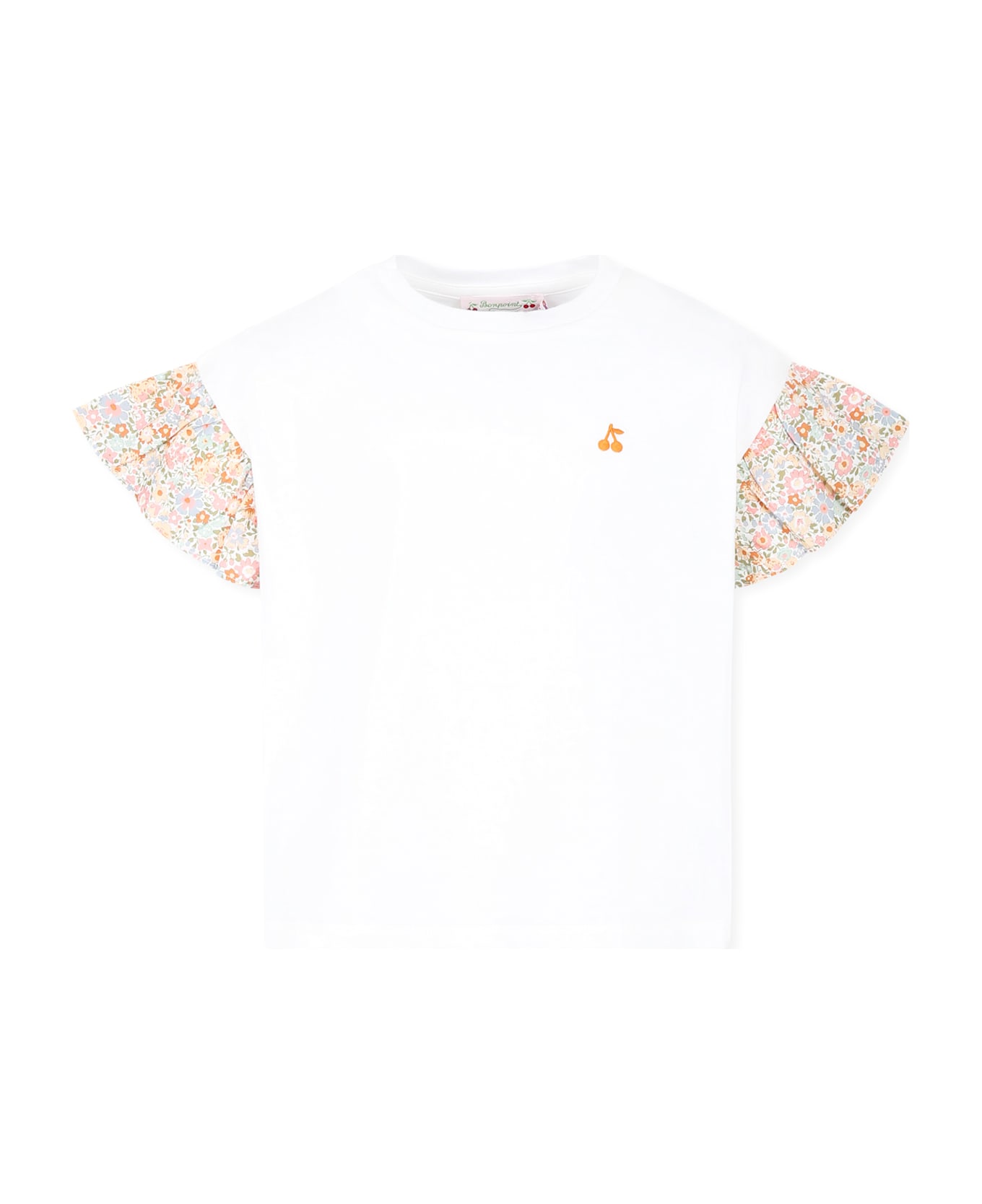 White cotton t-shirt, with short cap sleeves, in liberty fabric and ribbed crew neck. It is embellished with iconic cherries embroidered on the chest and floral print.