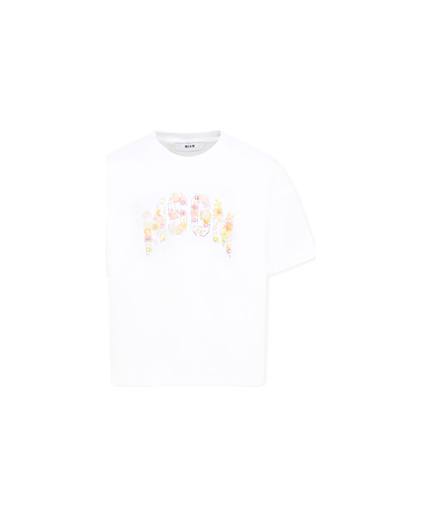 White cotton t-shirt, with short sleeves and ribbed crew neck. It is embellished with MSGM logo, rhinestones and flowers applied on the front.