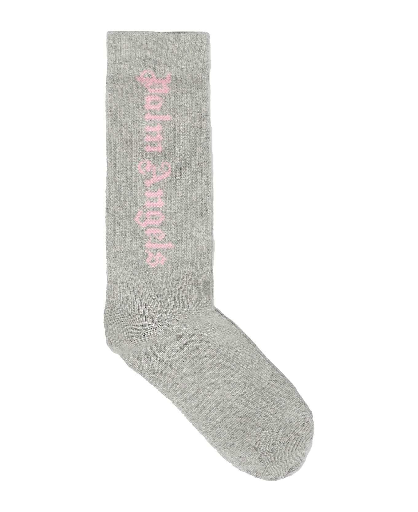 Grey terry socks with ribbed cuffs and a pink jacquard logo on the sides.
