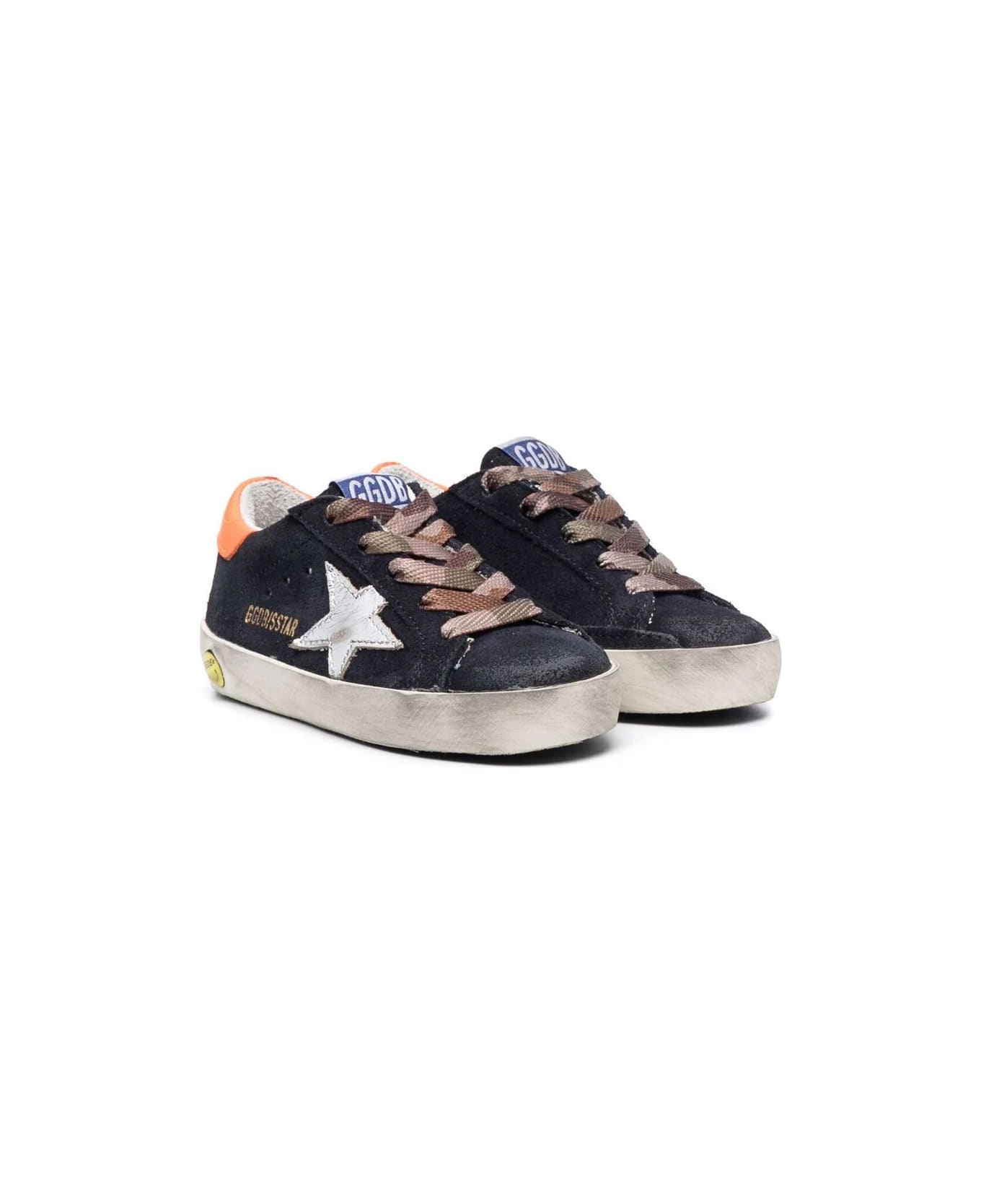 Super-Star sneakers for infant by Golden Goose Kids made of navy blue suede and characterized by a used effect, round toe, rubber sole, lace-up design with camouflage laces, spoiler in orange smooth leather and star in silver laminated leather.