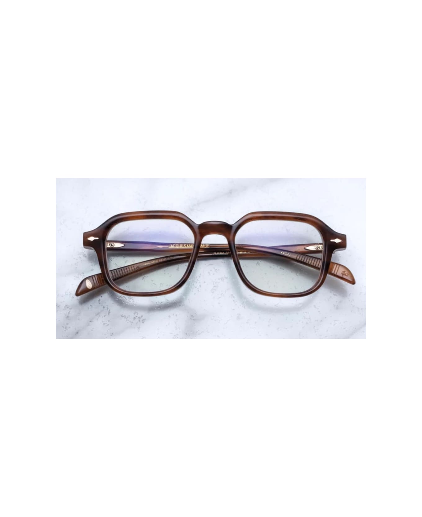 These eyeglasses have a rectangular shape with soft-edge design inspired by the '70's. Jacques Marie Mage Wagram Oak feature the light gold signature arrowhead front pin, light gold tension-secured 9 barrel hinge with spur-shaped rivets.