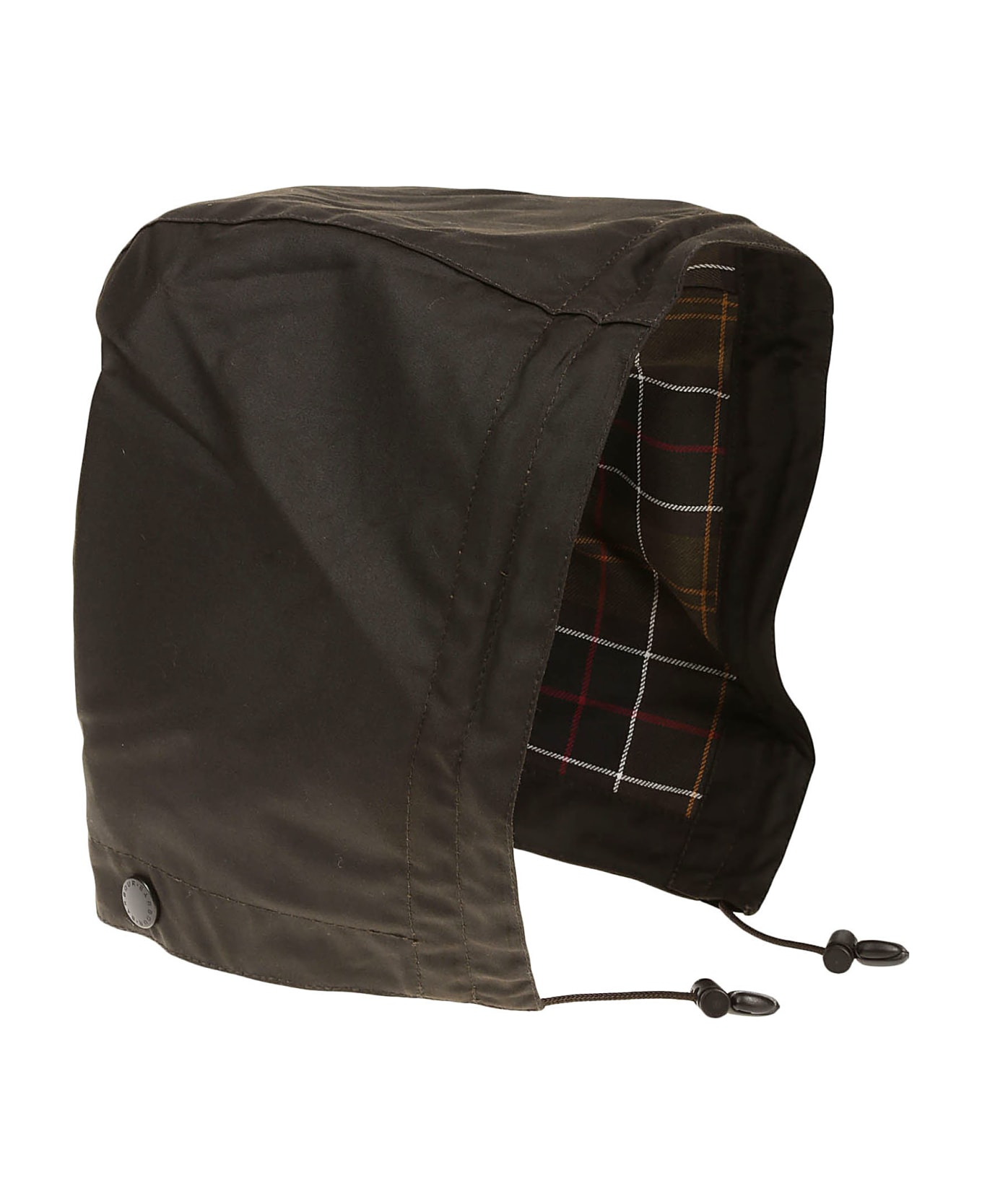 `BARBOUR hood made with 170-gram waxed cotton, adjustable for Barbour jackets with snap buttons. `