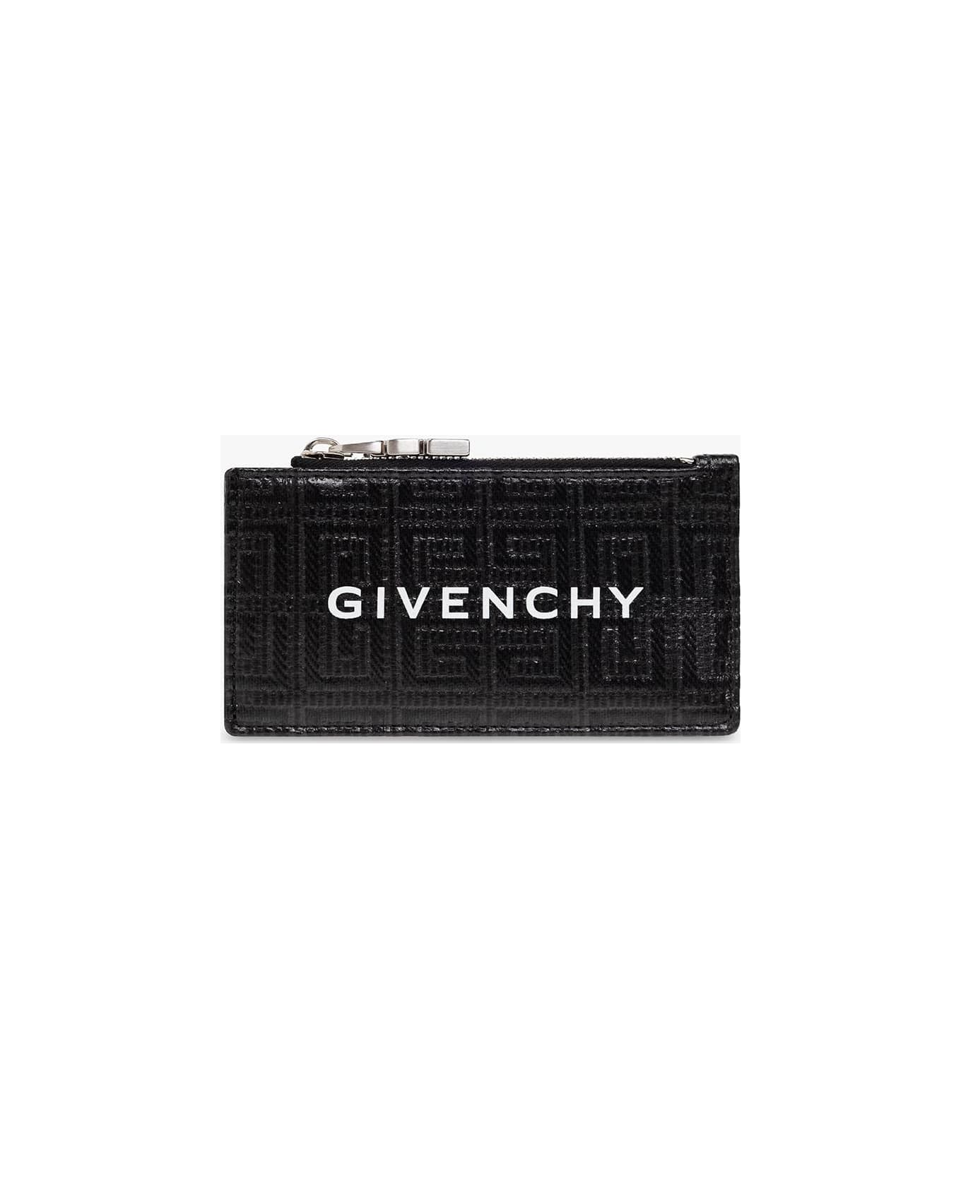 Black card case from Givenchy. Crafted from monogrammed canvas, this design features a printed white logo on the front, five card slots and one pocket with a silver-tone zipper. Composition: 74% Cotton 13% Acrylic 7% Polyurethane 6% Other Fiber