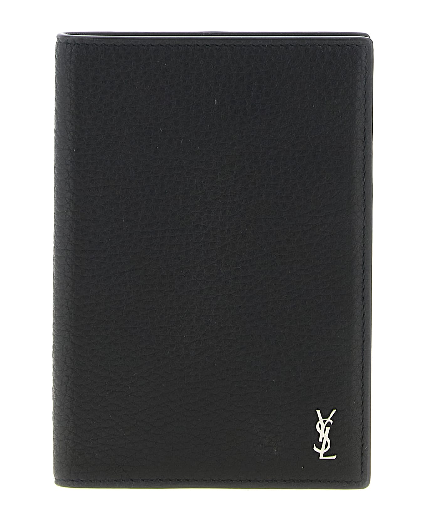 Hammered leather passport holder, front metal 'Tiny Cassandre' logo, and book opening.
