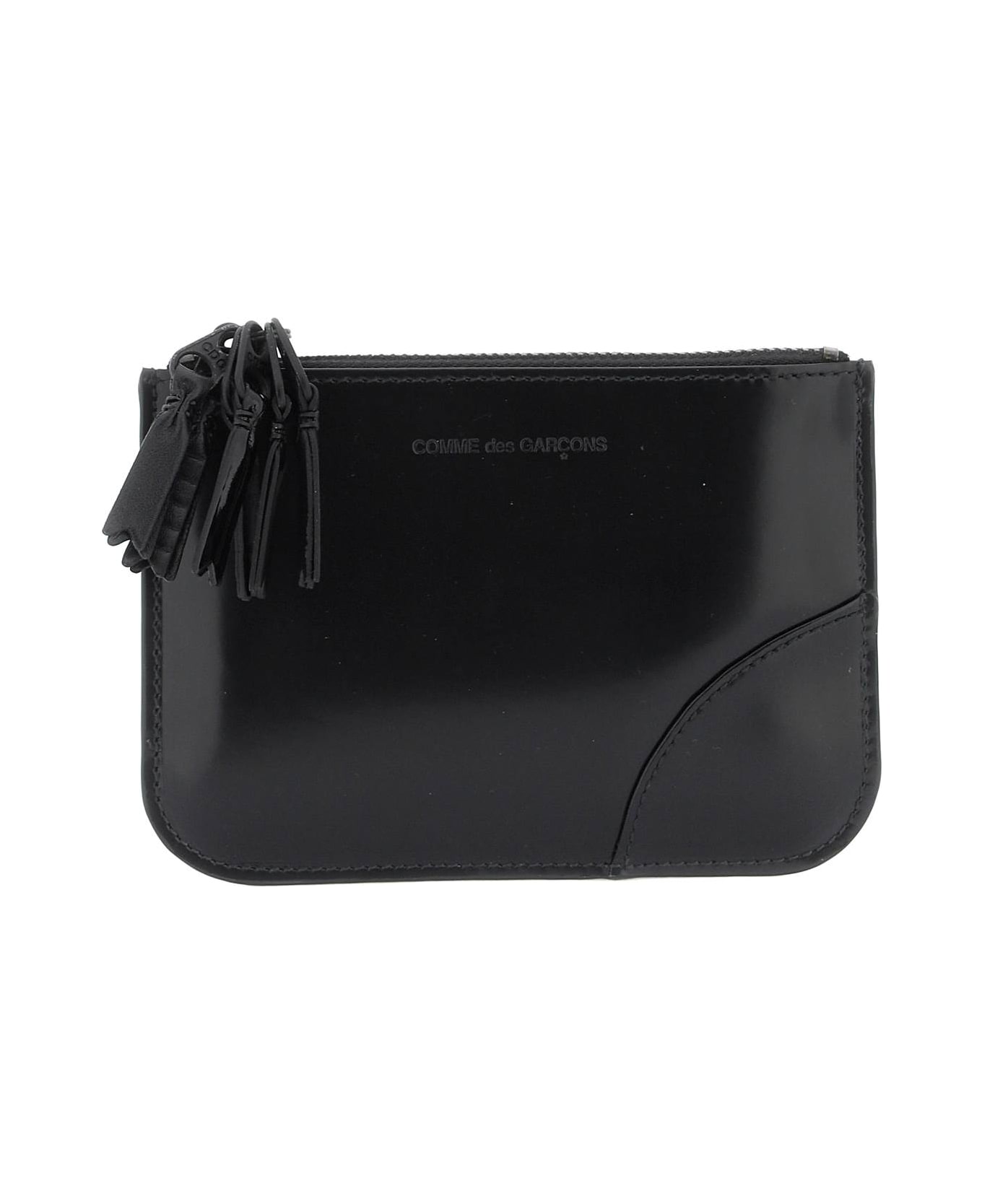 This Comme des Garçons wallet is made of brushed leather with an embossed logo and multiple zip pulls. It features a top closure, leather interior, and tone-on-tone insert on the front and back.