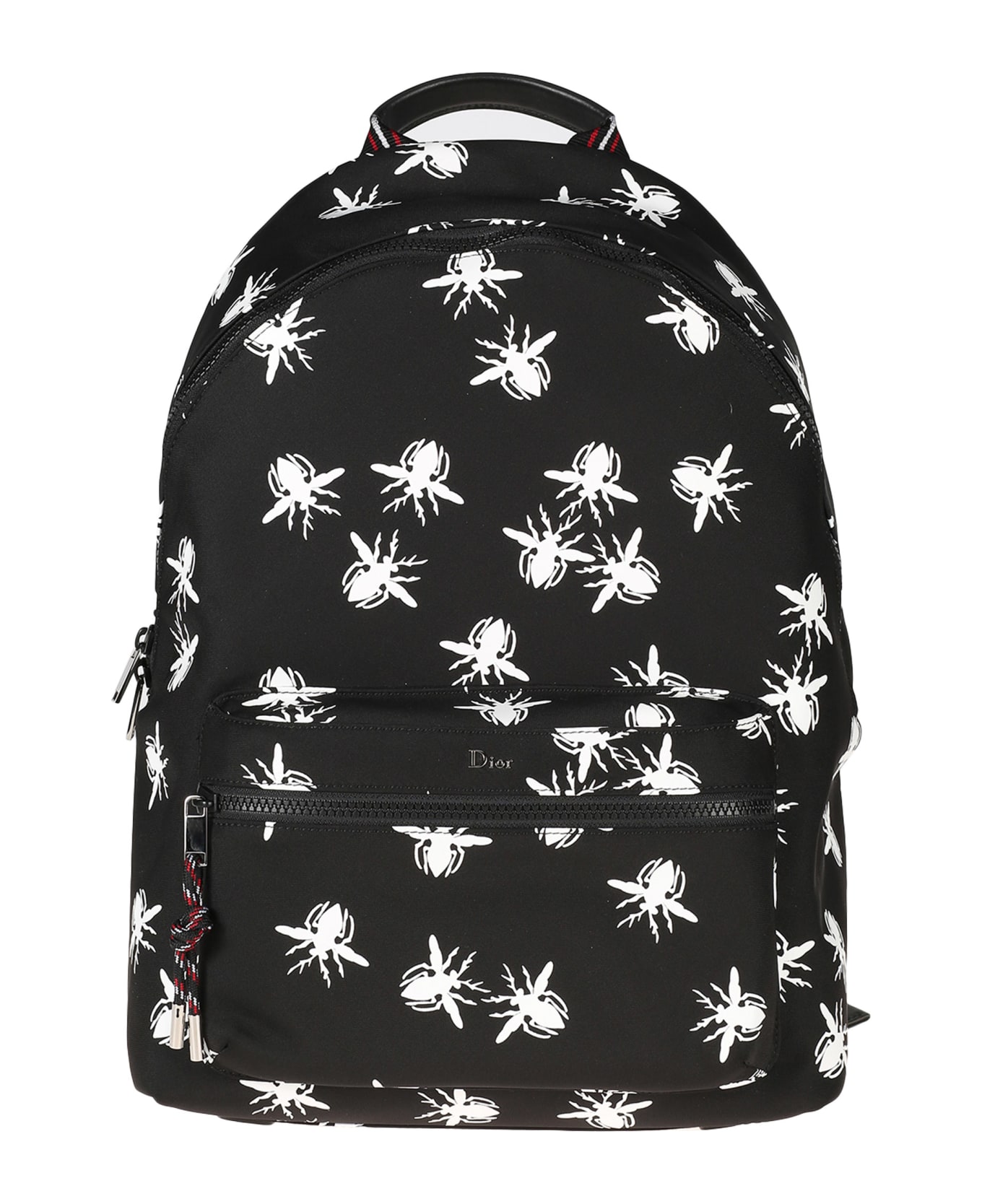 Insect print rucksack from DIOR HOMME: Black and white nylon and calf leather insect print rucksack featuring a rounded shape, an all-over print, an all around zip fastening, a main internal compartment, a full lining, an internal slip pocket, an internal logo patch, a front zip compartment, a flat top handle, adjustable shoulder straps and a padded back. Width:30 cm Height:42 cm Handle:6 cm Depth:15 cm Strap:40 cm