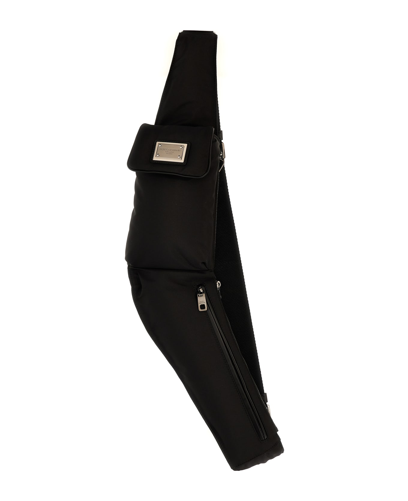 Nylon fanny pack with front logo plaque, magnetic flap closure, adjustable shoulder strap, and leather details. Composition: 80% pl 10% le 10% nylon