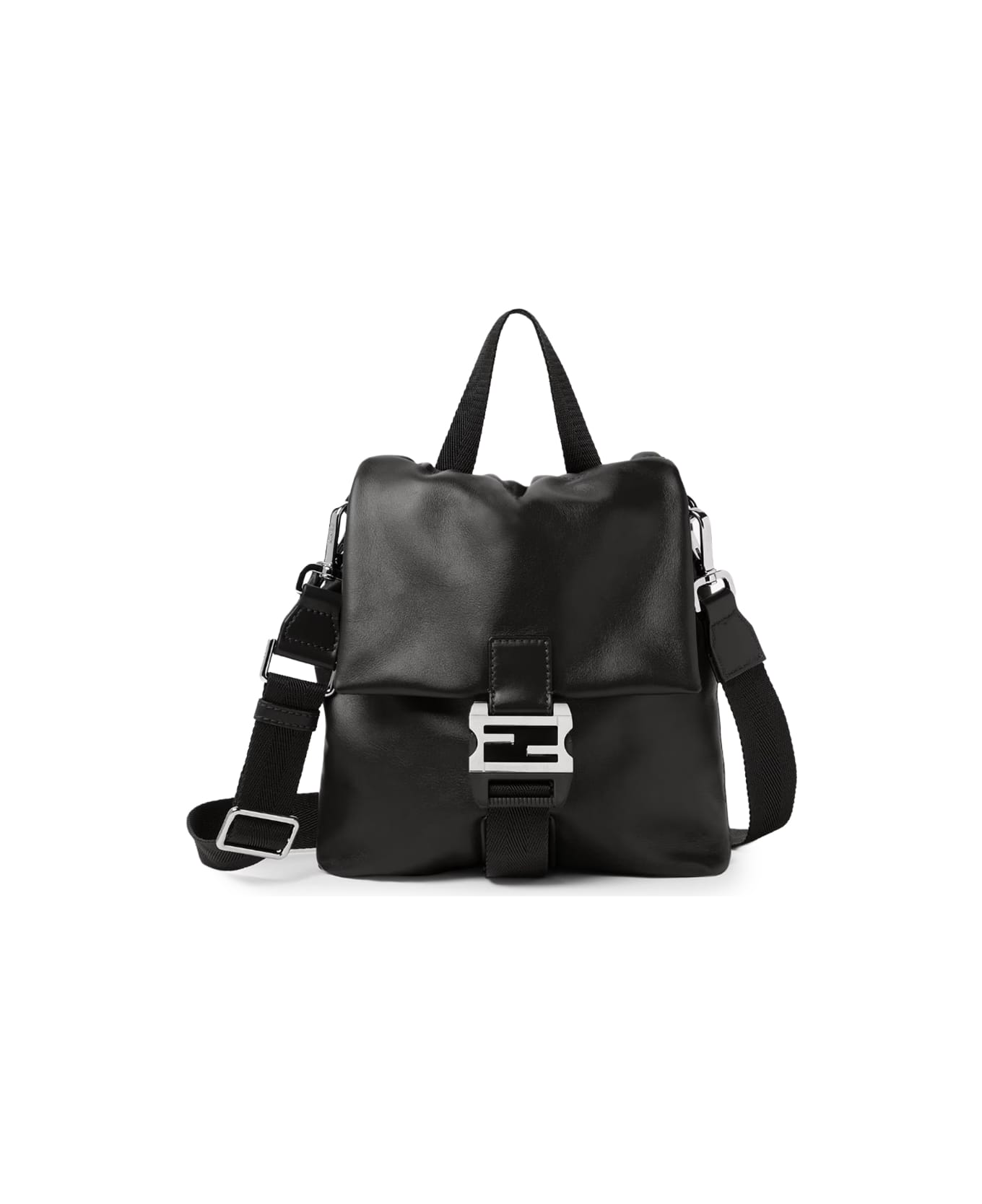 - Made of calfskin - FF tuc closure and central drawstring with strap - Technical fabric and leather shoulder strap - Dimensions: 25 x 19 x 6 cm - Made in Italy - Color: Black