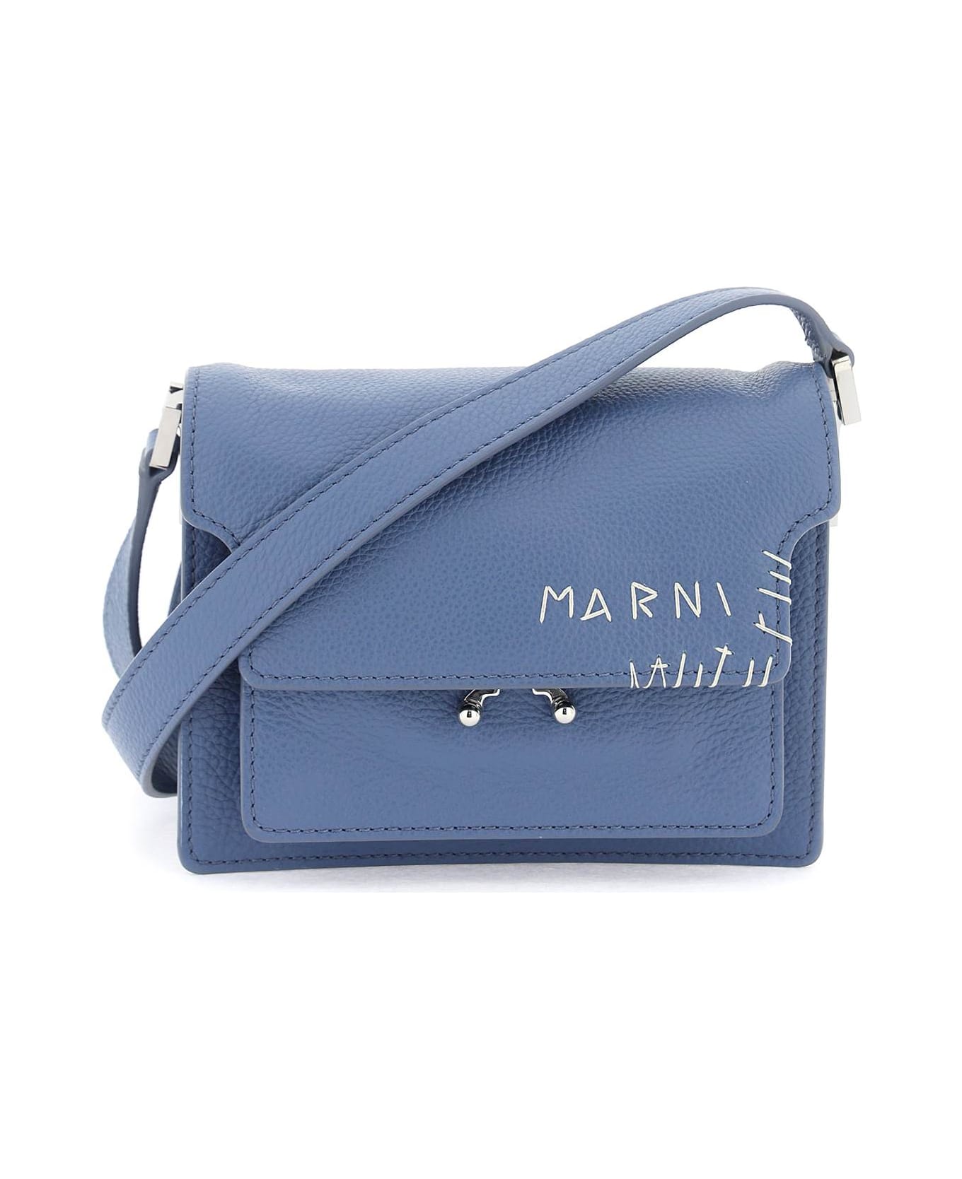 The Marni Trunk Soft mini shoulder bag is made of hammered leather with an adjustable strap and a snap closure flap. It features a back slit pocket, three compartments, one zippered interior pocket, one open pocket, and fabric lining. The flap is adorned with embroidered logo lettering. Metallic accessories have a silver finish. Composition: 100% calf leather