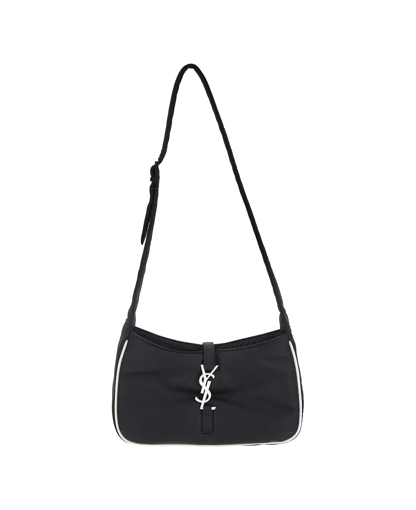 Saint Laurent shoulder bag in black nylon with white hems, white-toned metal YSL closure, adjustable shoulder strap, a main compartment and a zip pocket. Composition: 100% Nylon