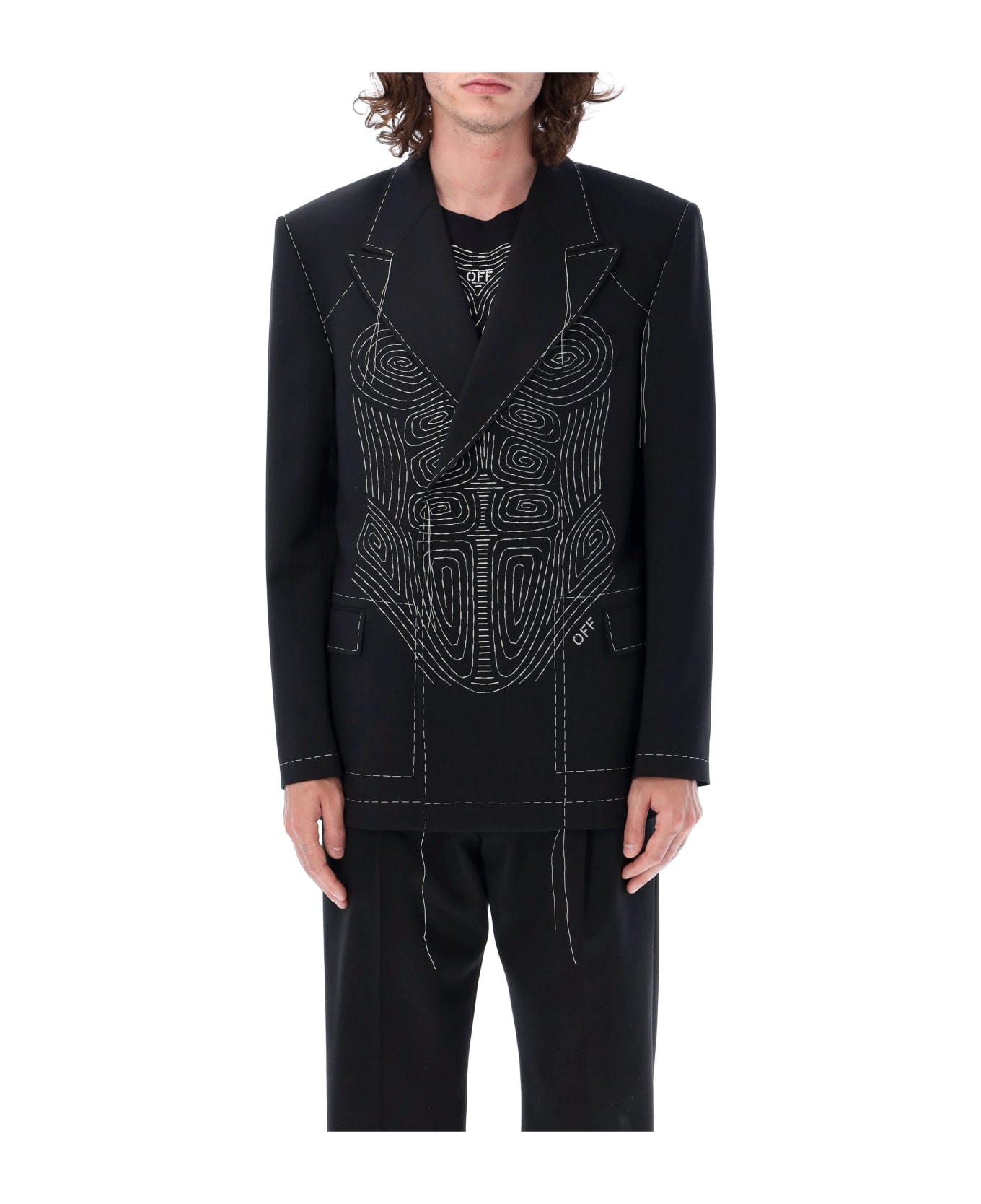 Wool-blend Body Stitch Tuxedo Double-breast Jacket By Off-white. Featuring: Peak Lapel Concealed Double-breasted Fastening Padded Shoulder Welt Chest Pocket Flap Pockets At Front White Stitching Throughout Long Sleeves Lined Double Vents At Back The Model Is 190 Cm Tall And He Is Wearing Size 50