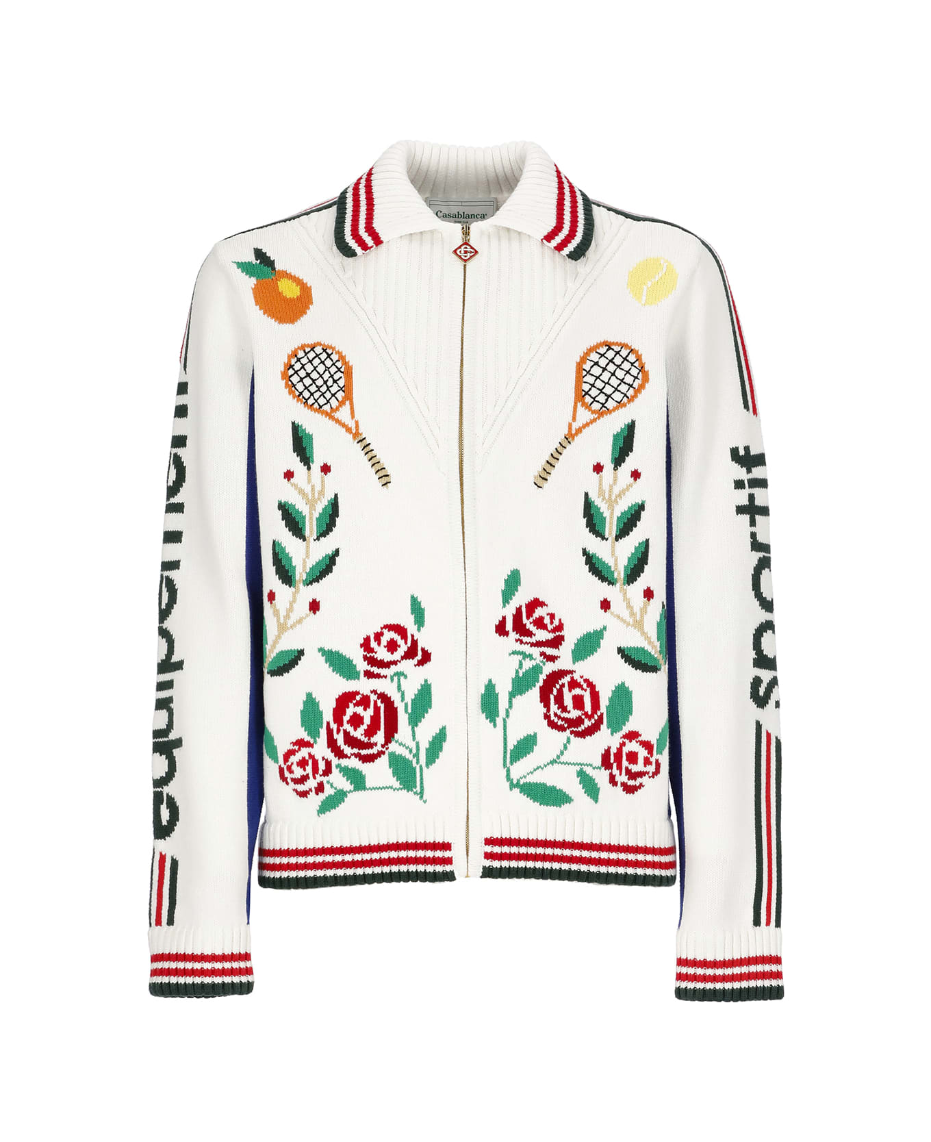 - White Casablanca cotton jacket for man - Collar - Front contrasting color zip fastening - Long sleeves - Two side slit pockets - Elastic ribbed trims - All-over contrasting color pattern Composition: 100% Cotton