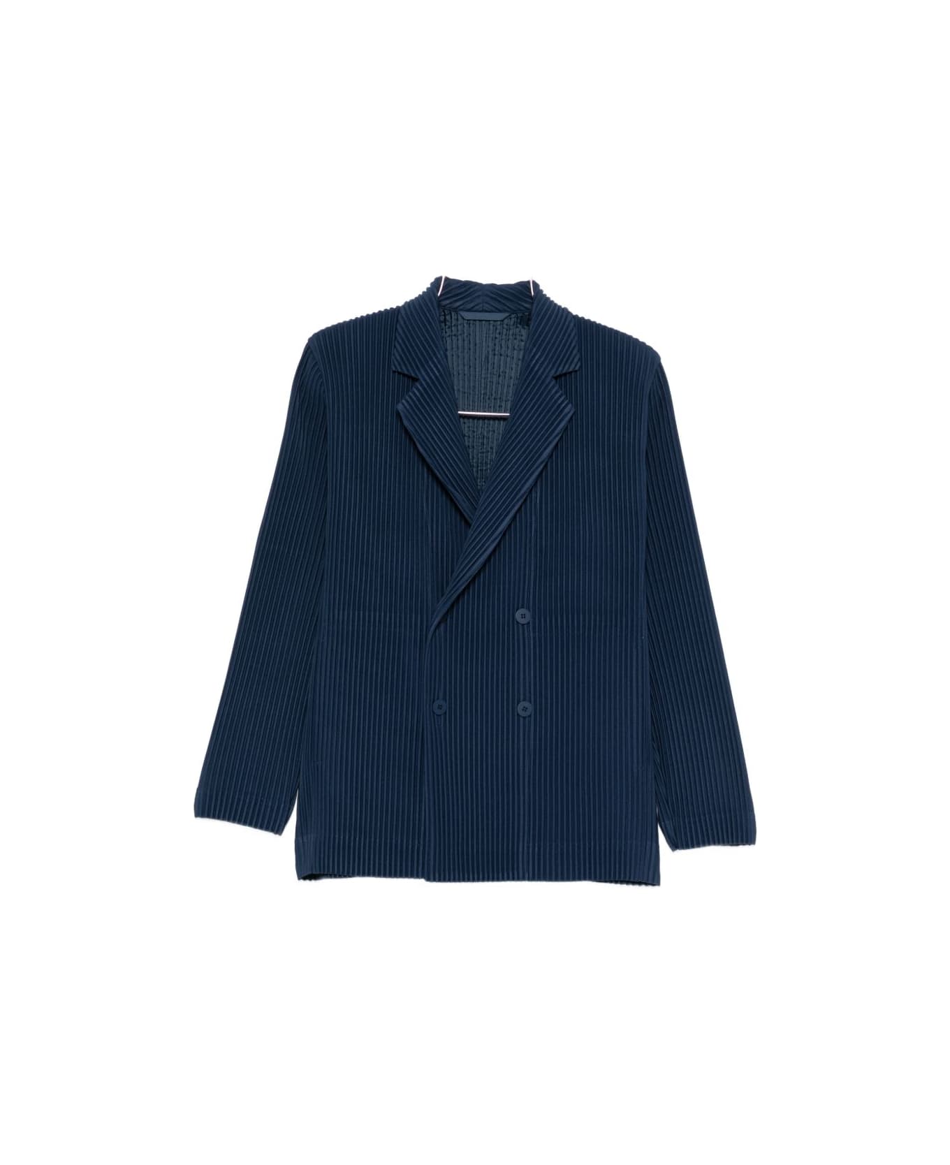 blue pleated design notched lapels double-breasted button fastening