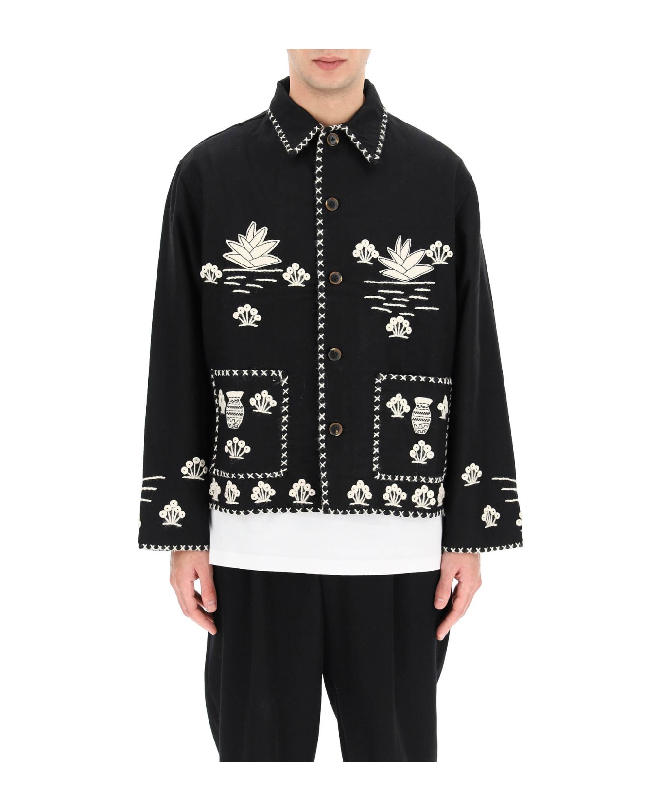 Bode jacket in merino wool fabric, inspired by a souvenir jacket from the '40s, with all-over Mexican embroidery and applications. Boxy cut, classic shirt collar, horn button closure and front patch pockets. Logo lettering embroidered on the back. Prints may vary, each garment is unique. The model is 185 cm tall and wears a size M/L.