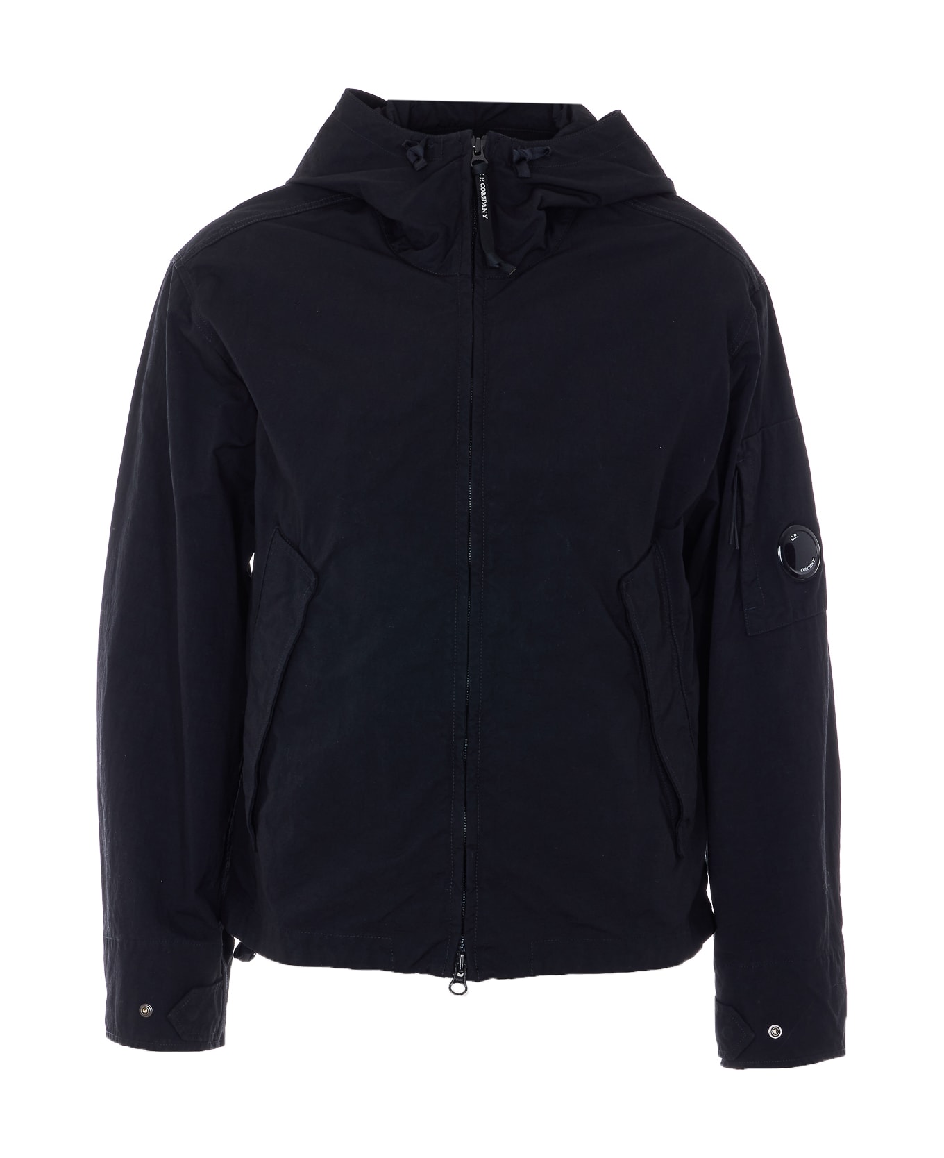 C. P. Company black jacket with zip closure, hood detail, pockets with button closure