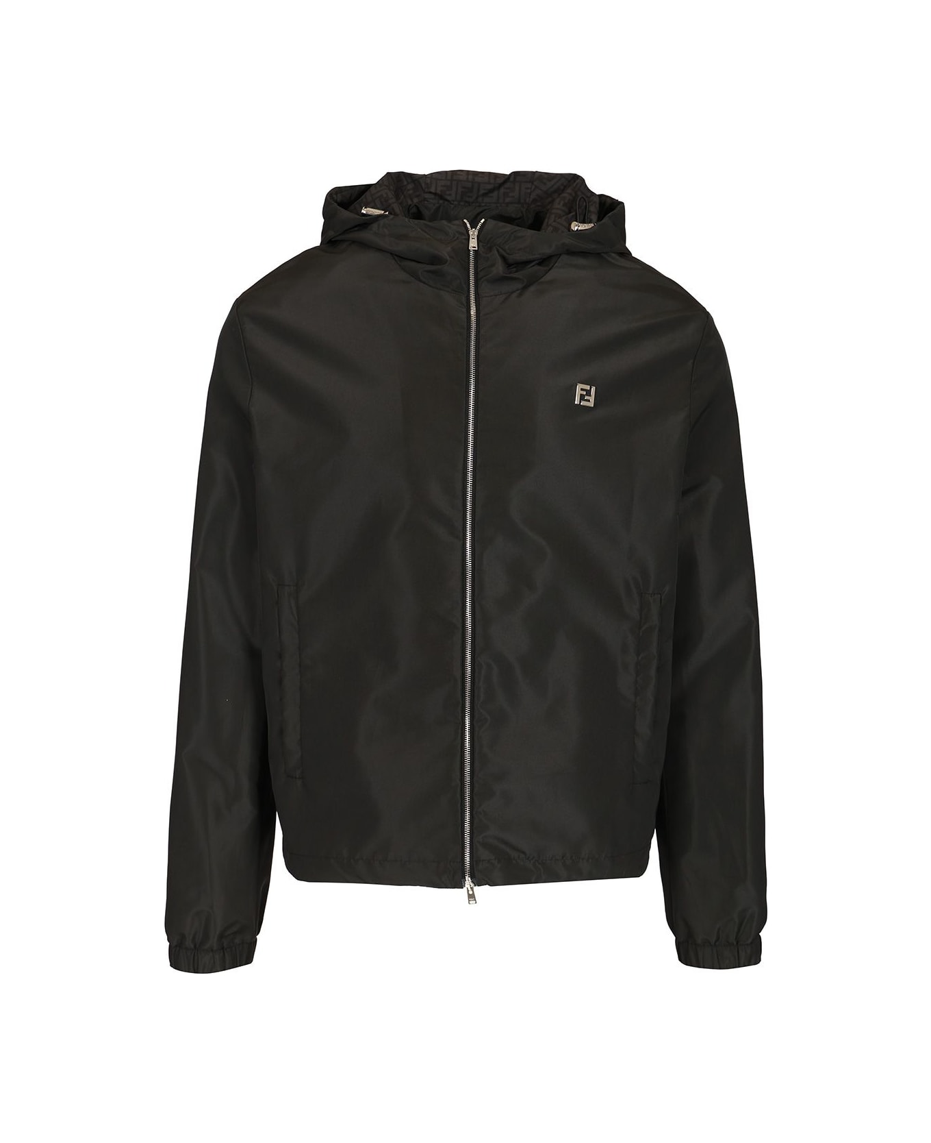 Blouson with drawstring hood and side pockets. Elasticated cuffs and hem. Double-slider zip closure. Made of black technical fabric. Personalized with a small metal FF logo on the chest Composition: 100%PL+FOD. :100%PL