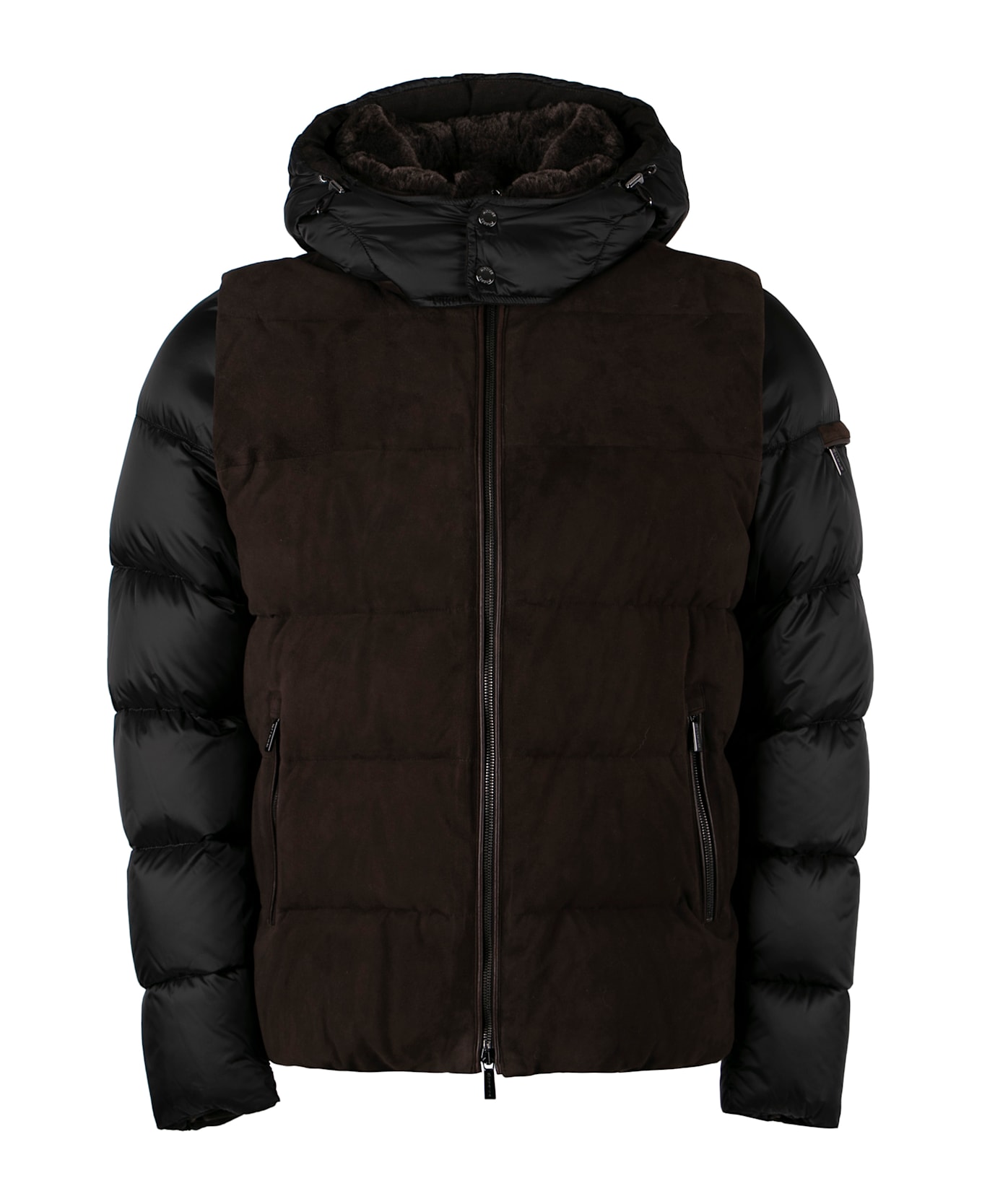 Removable sleeves with zip decorative zip pocket on the sleeve two zipped pockets padding: 100% goose down 100% leather, 100% polyamide Composition: 100% % Leather, 100% % Polyamide