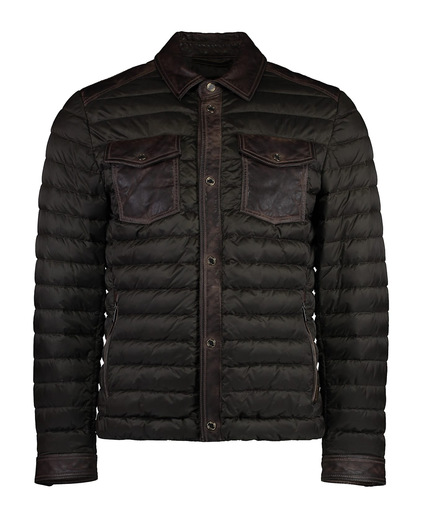 Two buttoned front flap pockets two side zipped pockets padding: 100% goose down 100% polyamide, 100% leather Composition: 100% % Polyamide, 100% % Leather
