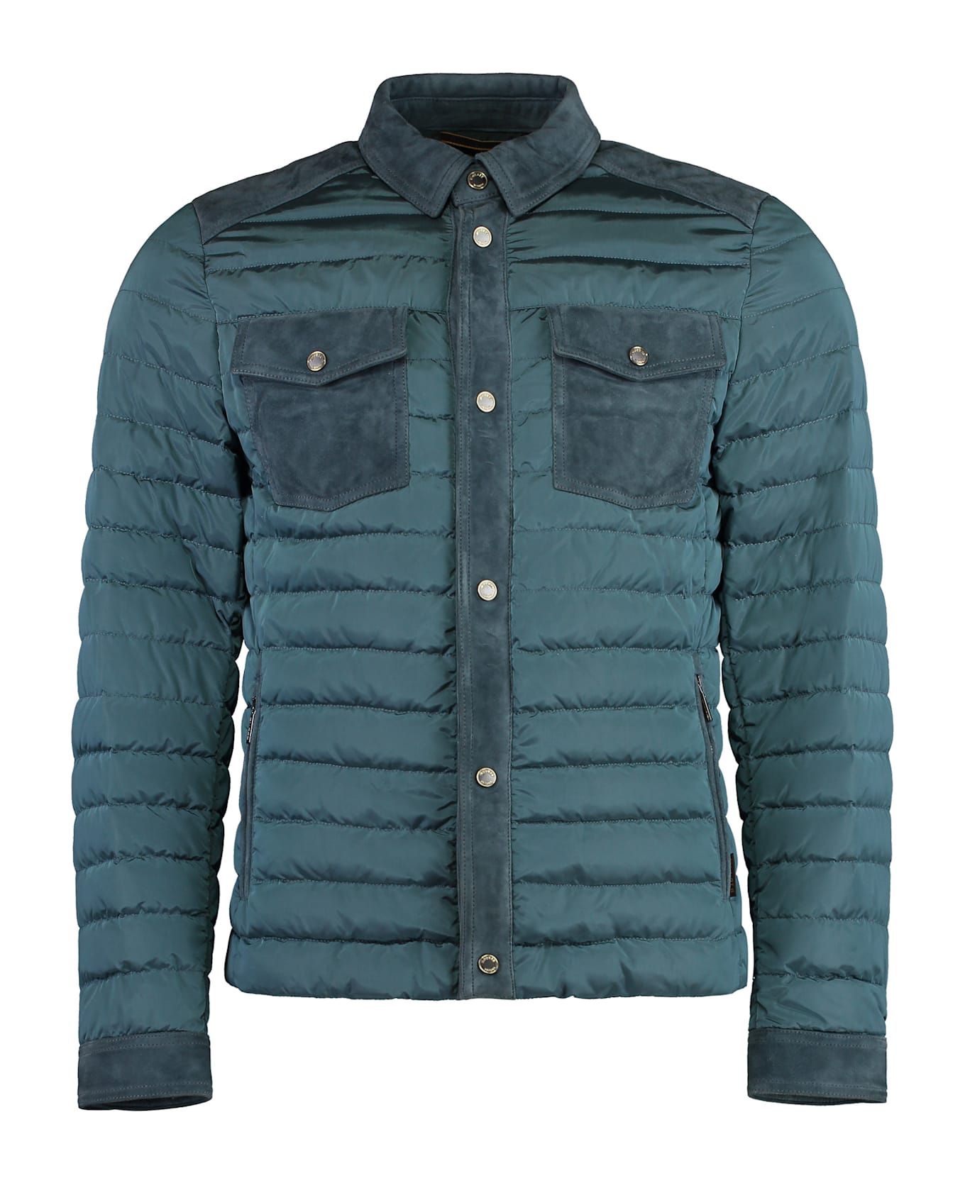 Suede inserts two buttoned front flap pockets two zipped pockets padding: 100% goose down 100% plastic, 100% cow hide Composition: 100% % Plastic, 100% % Cow Hide