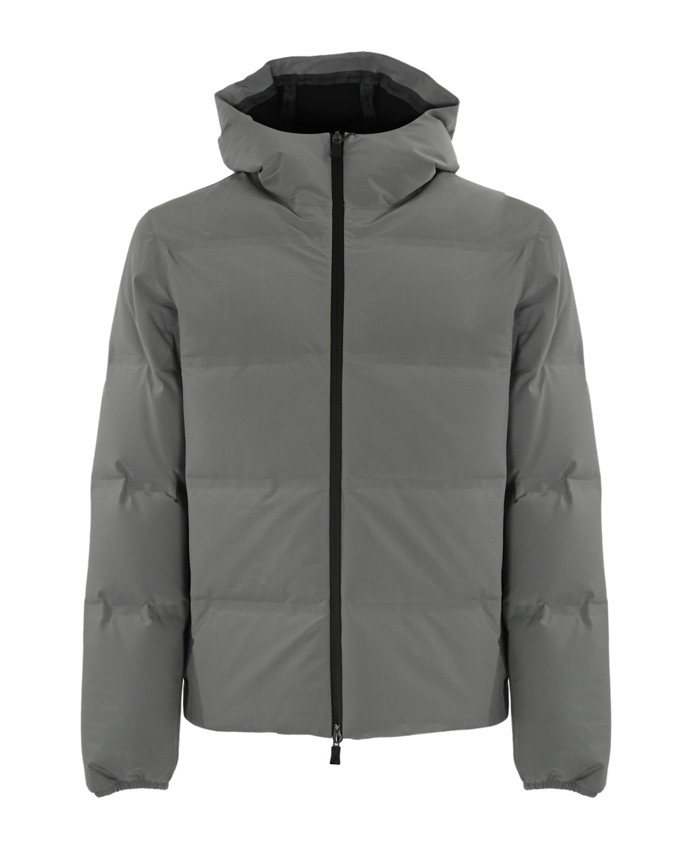padded men's down jacket: bomber jackets long sleeves double slider zip closure polyurethane zip coating laminated opaque fabric hood zip pockets adjustable bottom with drawstring lined padded regular fit composition: 89% polyamide, 11% elastane lining: 85% polyamide, 15% elastane padding: 70% goose down, 30% polyester