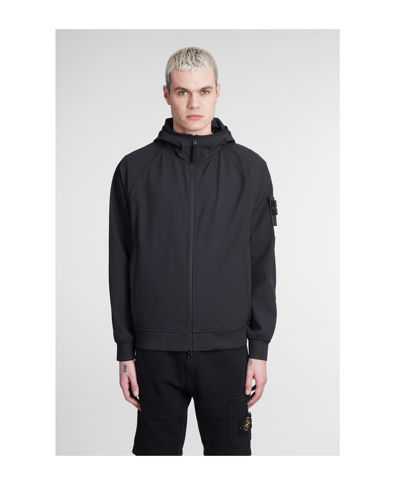 Casual jacket in black polyester, hood, long sleeves, ribbed cuffs and bottom, pockets, zip clousure, patch logo on sleeve, Model is 1. 83 and wears size S, 92% polyester, 8% elastan, Made in China