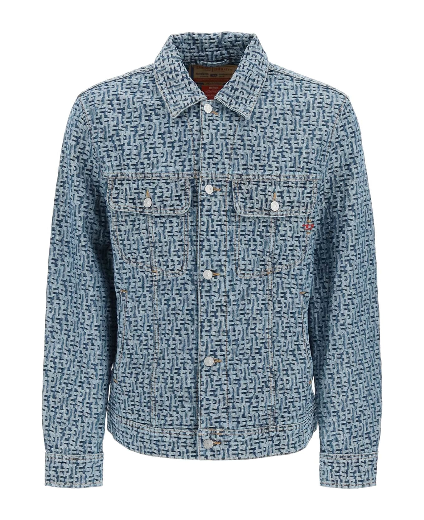 Diesel denim jacket with all-over monogram jacquard motif. Classic design featuring shirt collar and metal buttons, side welt pockets and two chest pockets with buttoned flap. Contrast embroidered logo D detail at the chest. The model is 187 cm tall and wears a size L. Composition: 100%CO