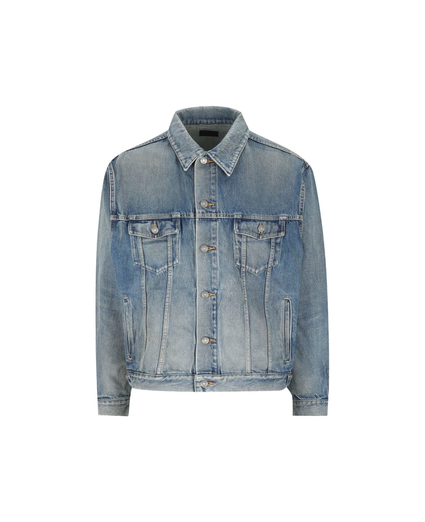 mid blue button fastening chest pockets point collar long sleeves buttoned cuffs