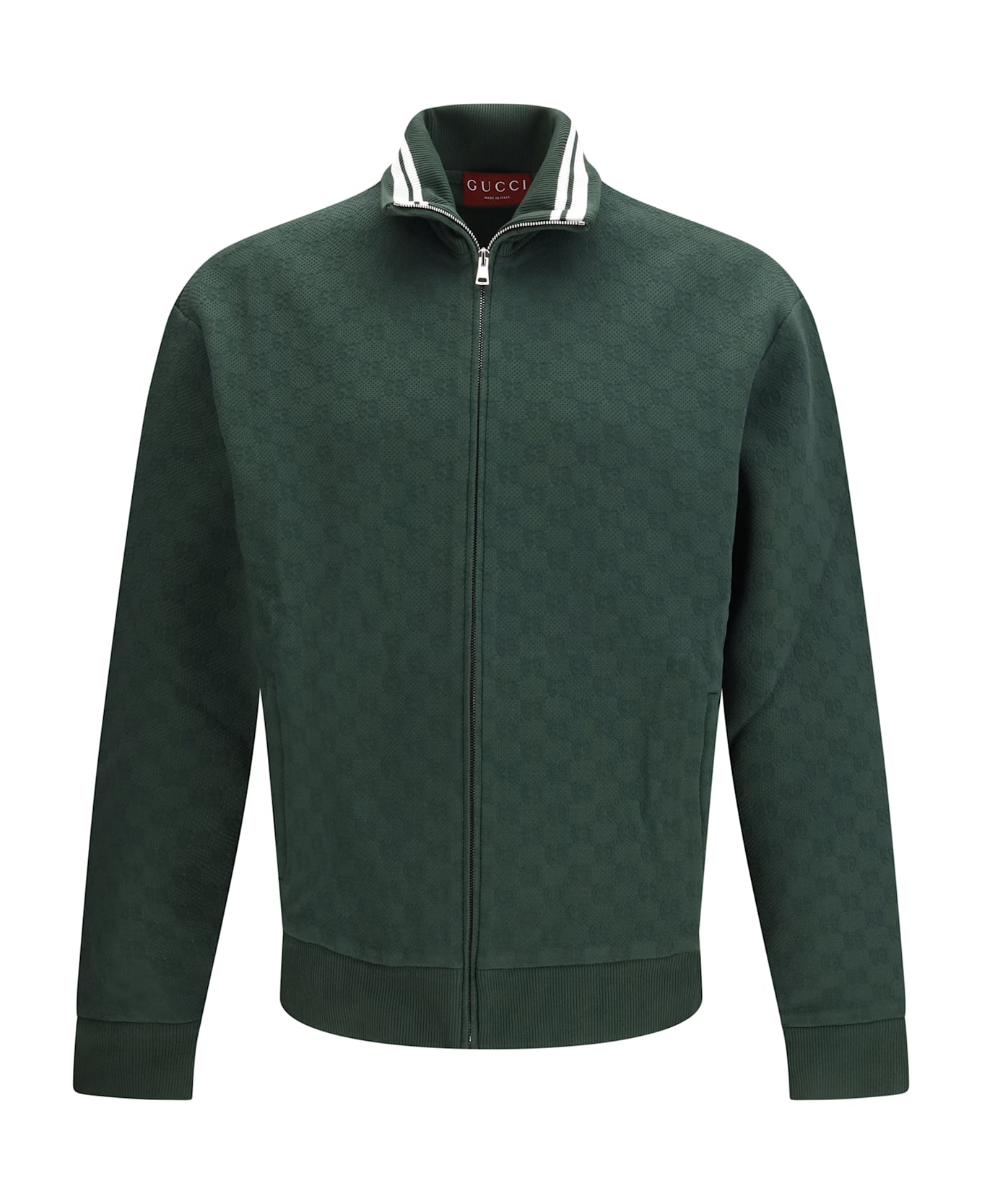The gg technical jersey zip jacket by gucci transforms the brand s iconic motif into a contemporary textural expression. crafted from technical jersey with an embossed gg pattern, it features a high collar that defines the silhouette and ribbed trims that add structure. front pockets and a zip closure complete a clean, functional design conceived to express identity and modernity through refined construction.