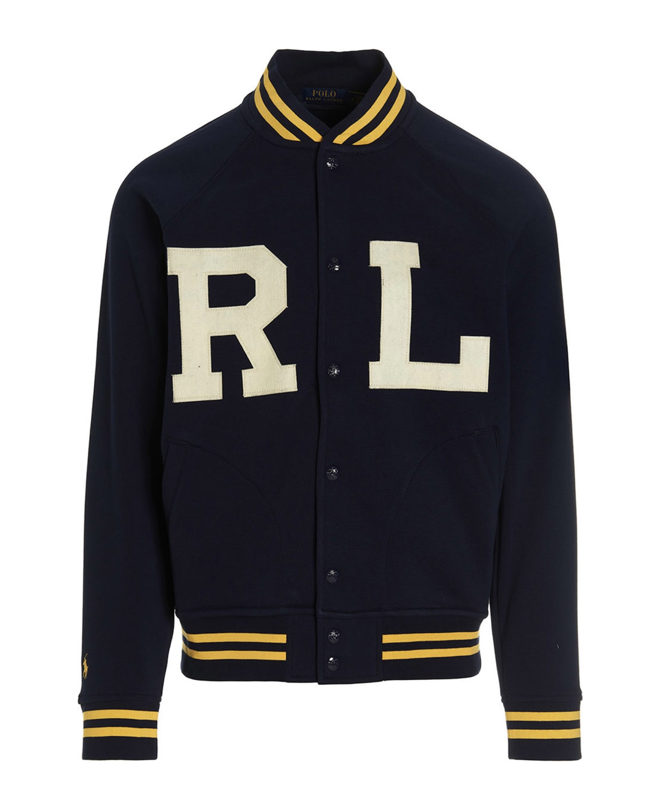 Cotton blend bomber jacket with front 'RL' logo patch, button closure, pockets and long cuffed sleeves.