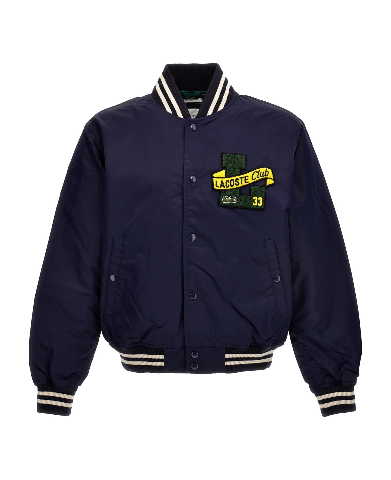 Varsity' padded nylon bomber jacket with logo patch at the front and back, a button closure, pockets, long cuffed sleeves, collar and a knitted hemline.