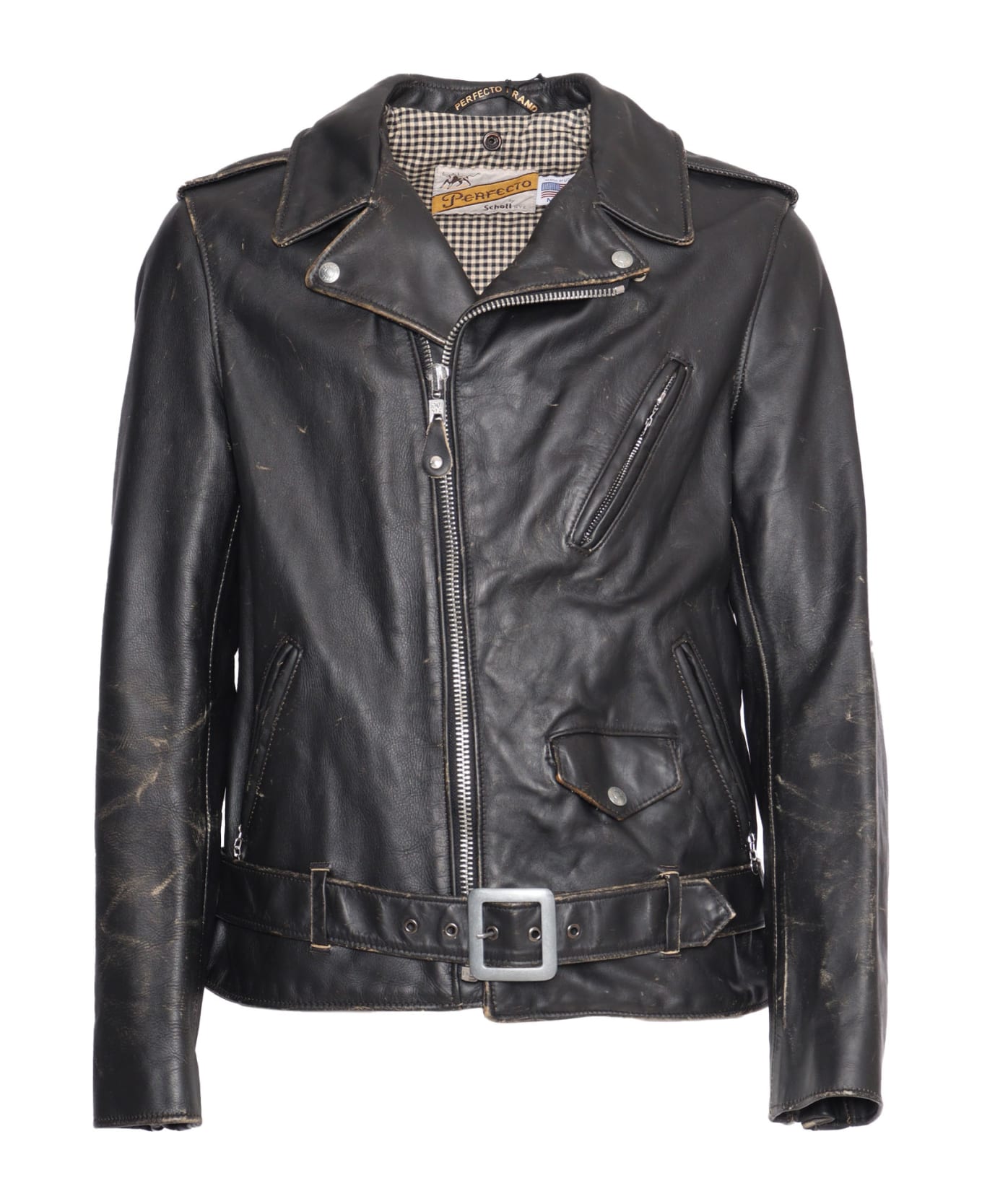 Calfskin biker jacket, used effect, zip fastening, chest pocket with zip, slanted pockets with zip, pocket with flap and press stud, matching belt, check interior, shoulder tabs Composition: 100% CALF SKIN