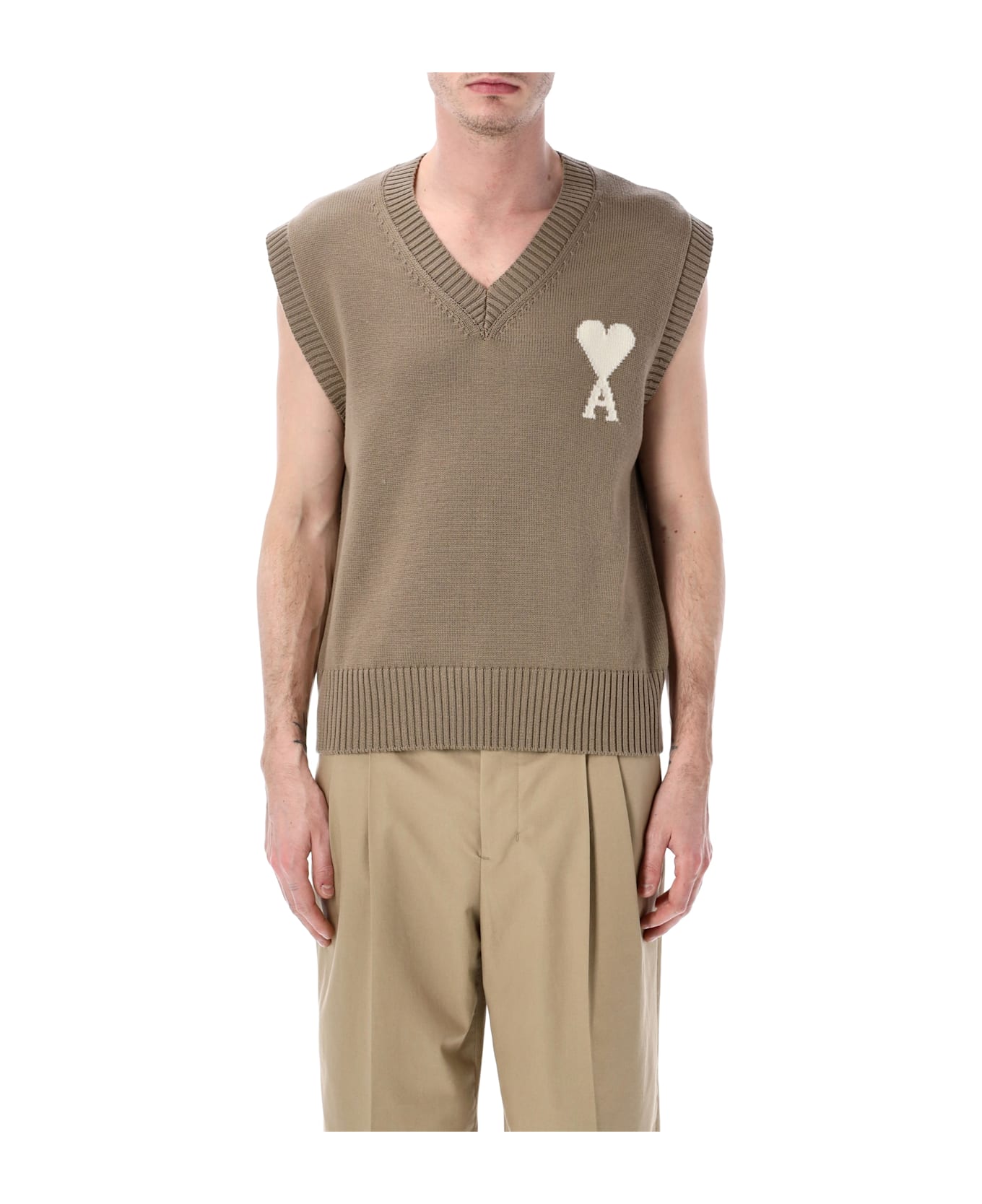 The Ami Paris Sleeveless Knit Delivers A Clean, Modern Take On Everyday Layering. Crafted From A Wool And Cotton Blend, It Features A V-neck Silhouette With A Versatile, Unisex Fit. The Signature Ami De Coeur Intarsia On The Chest Adds A Distinctive Graphic Accent, Making It A Refined Yet Casual Wardrobe Essential. Wool And Cotton Knit
