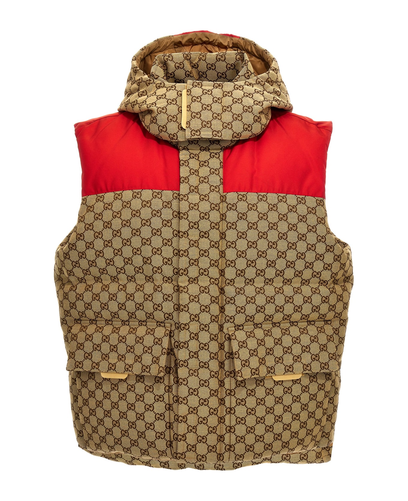 Vest in 'GG' fabric with goose down padding, removable hood, and pockets. Composition: 70% cotton, 30% polyester