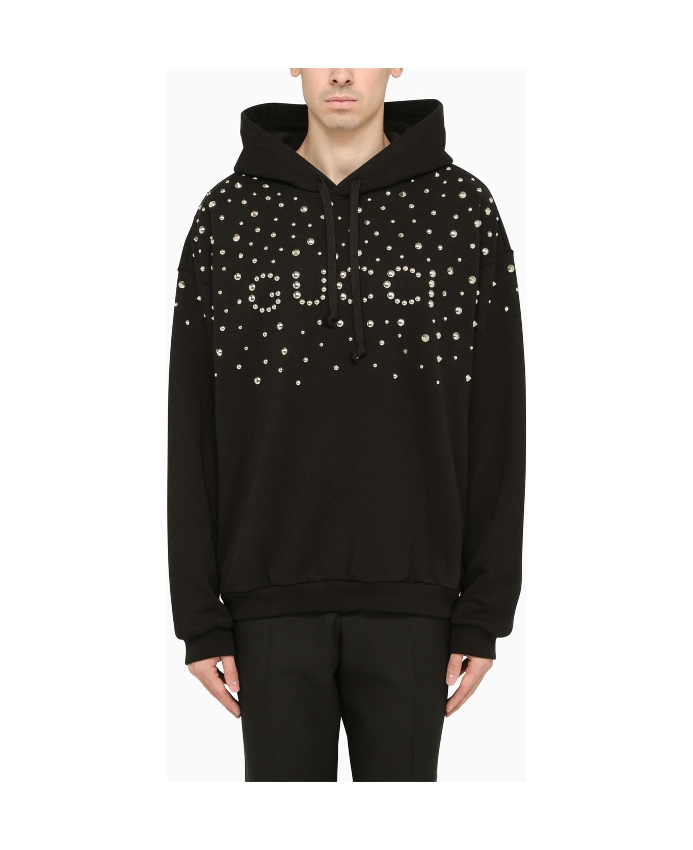 Black hoodie by Gucci in felted cotton defined by studded logo motif. Composition: 100% Cotton