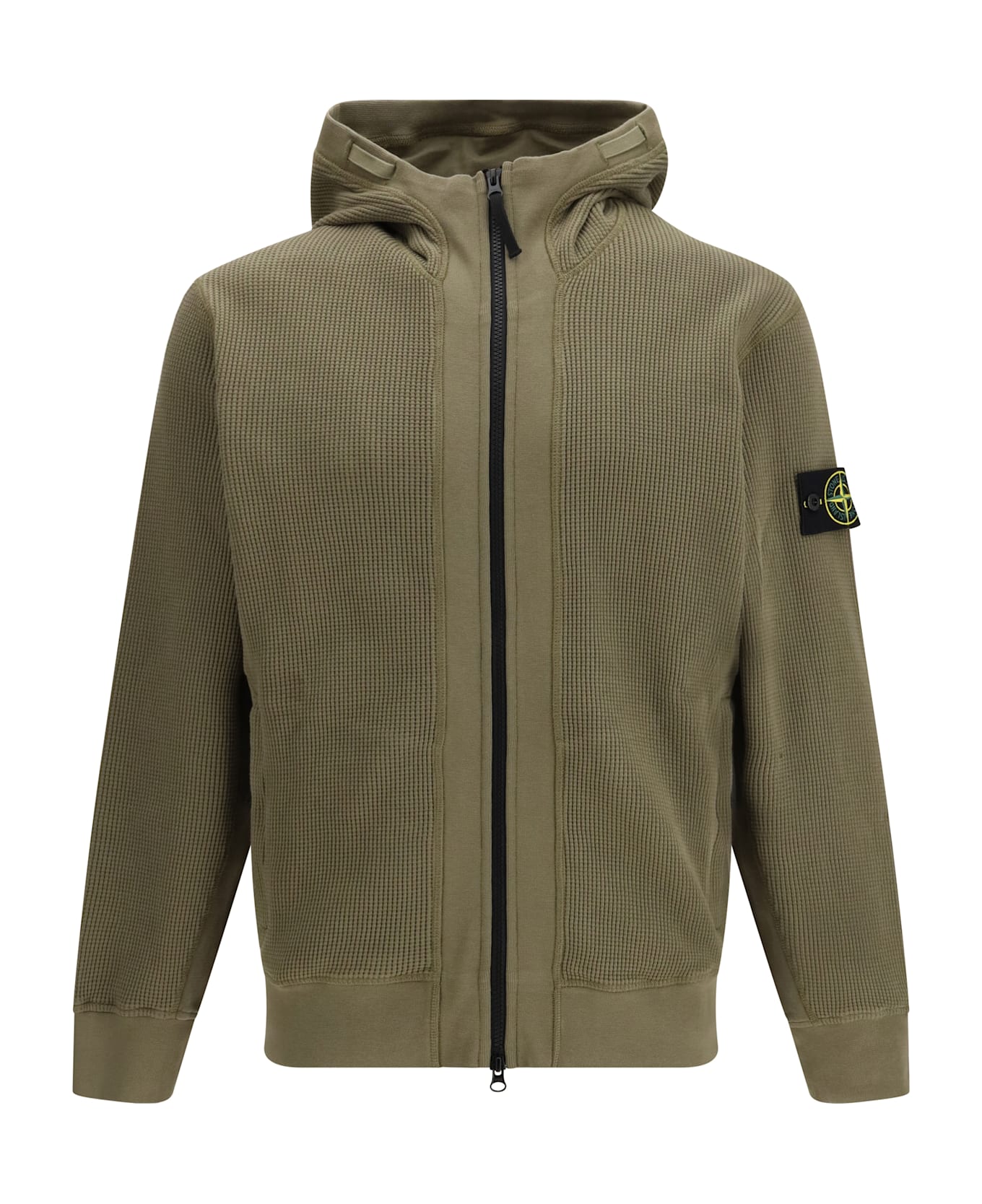 The cotton zip-up hoodie ghost by stone island features a textured fabric that enhances its fully monochromatic look. the design includes a two-way front zip closure, a hood with ribbed edging, and ribbed cuffs and hem for a balanced fit. part of the ghost line, the piece reworks the concept of camouflage through a completely tonal approach. the stone island badge, crafted in a special monochrome version, blends seamlessly into the garment, highlighting its understated and refined aesthetic.