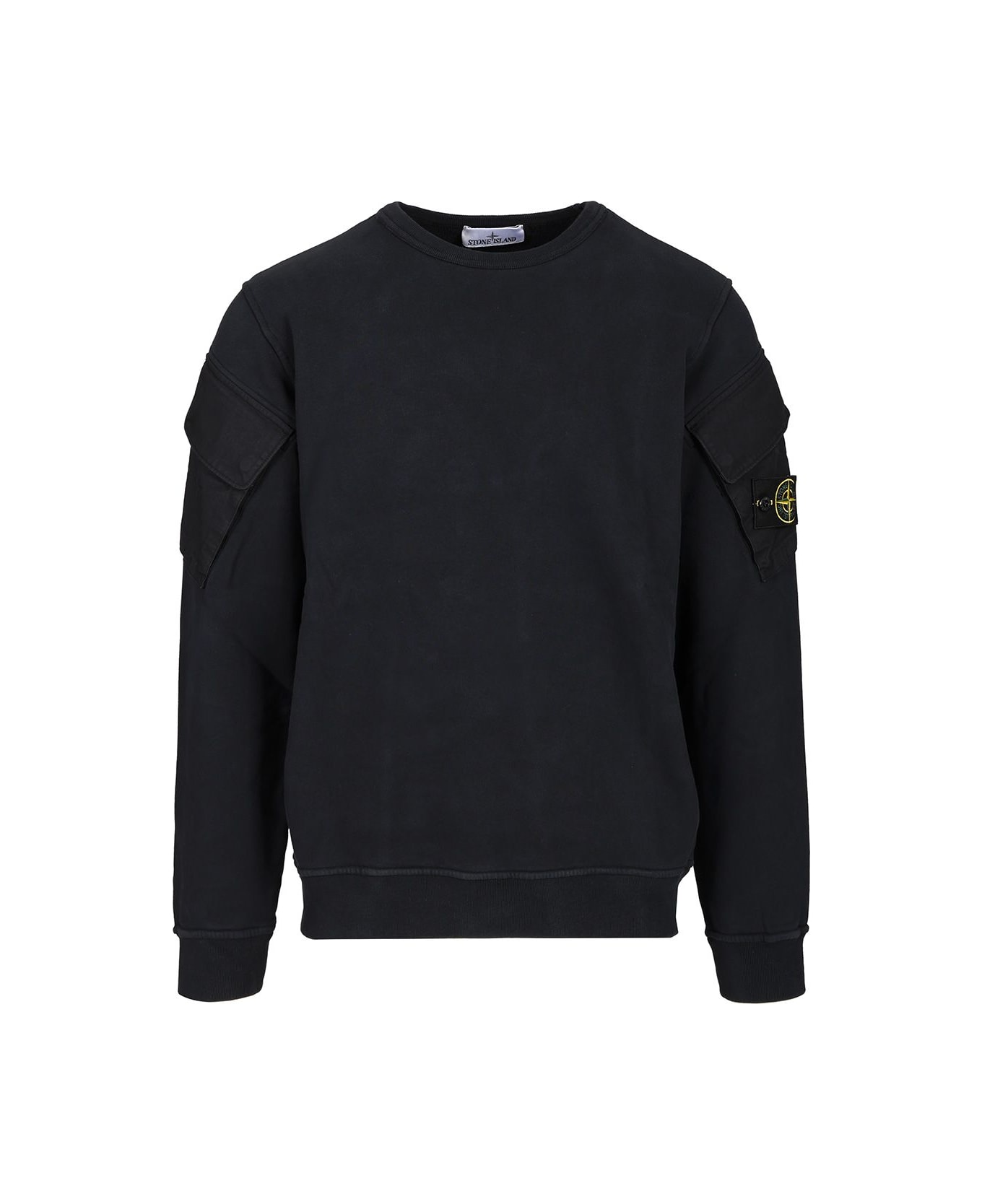 Ribbed neckline. Contrasting fabric bellows pocket on sleeves with two snaps under flap Stone Island badge on left sleeve pocket. Elasticated ribbed cuffs and bottom band. Regular fit.