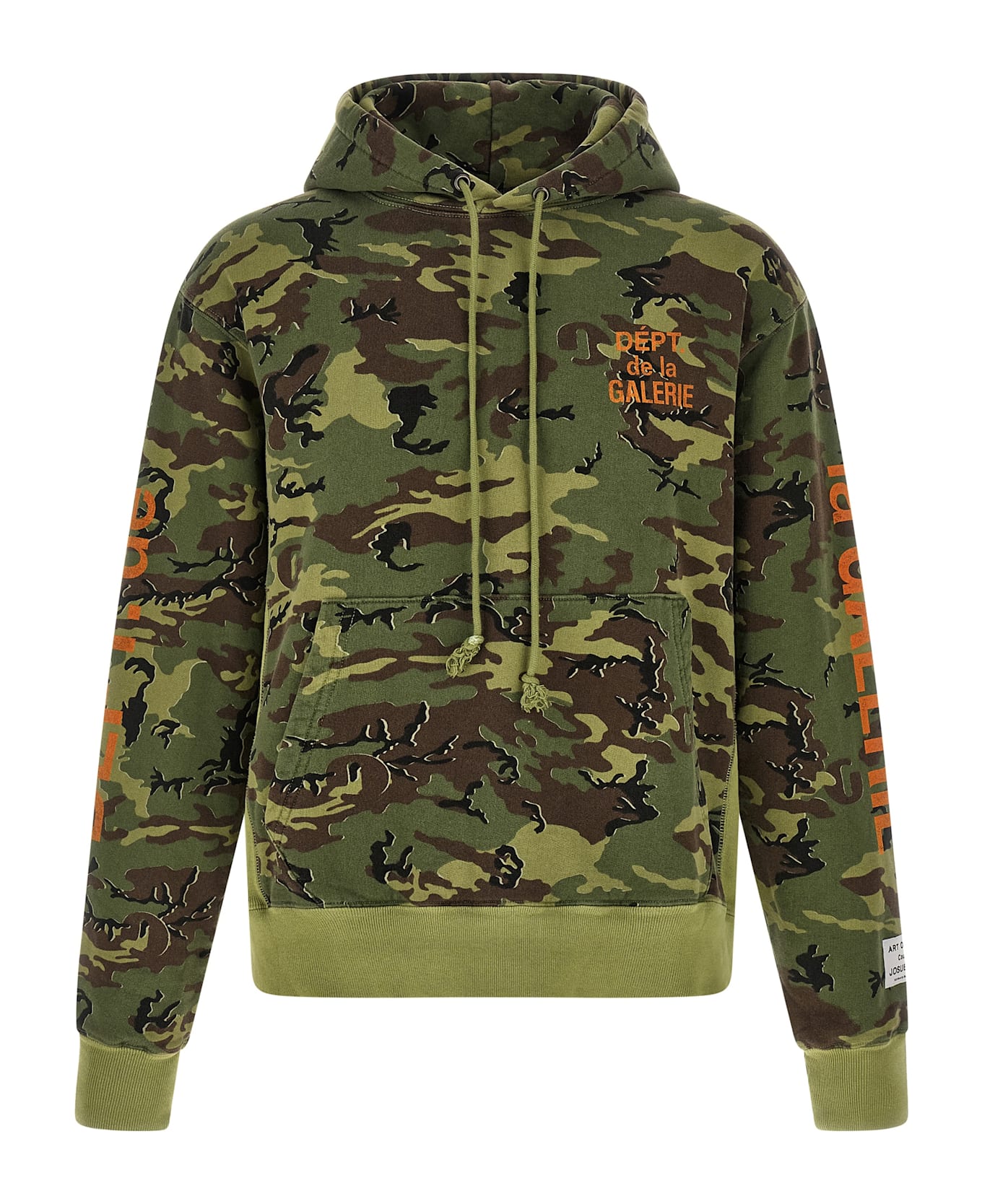 'Dépt. De La Galerie' hoodie in slightly fleece cotton with camouflage print and one color, 'French Dépt. ' logo prints, kangaroo pocket, long cuffed sleeves and 'art on display patch' applied. Made with the washing process patented by Gallery Dept. that uses unique discoloration techniques for each garment, including logos and graphics.