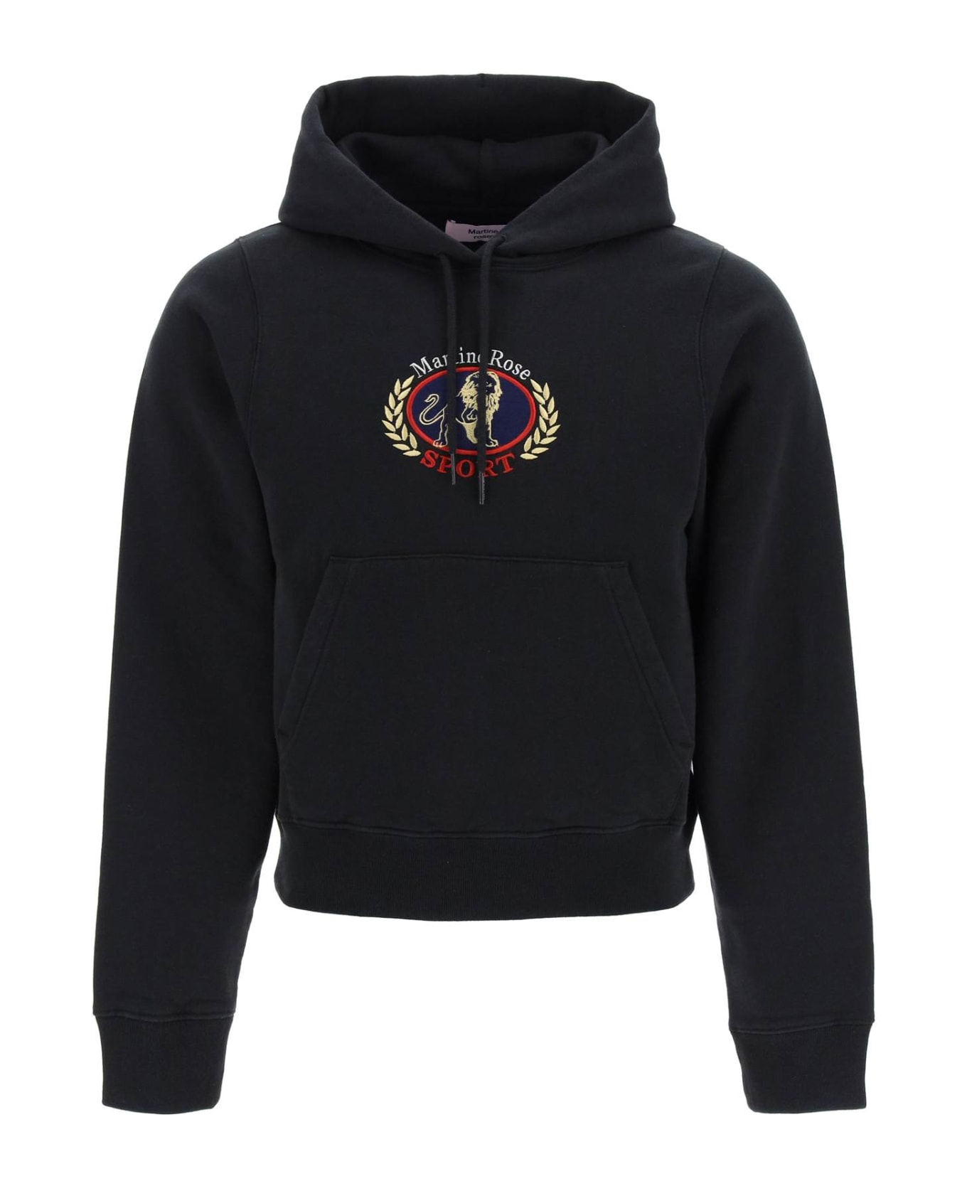 Brushed-back cotton jersey hoodie by Martine Rose featuring elastic drawstring, ribbed hems, kangaroo pocket. Decorated with contrasting graphic and lettering logo embroidery. Short cut, regular fit. The model is 187 cm tall and wears a size M.