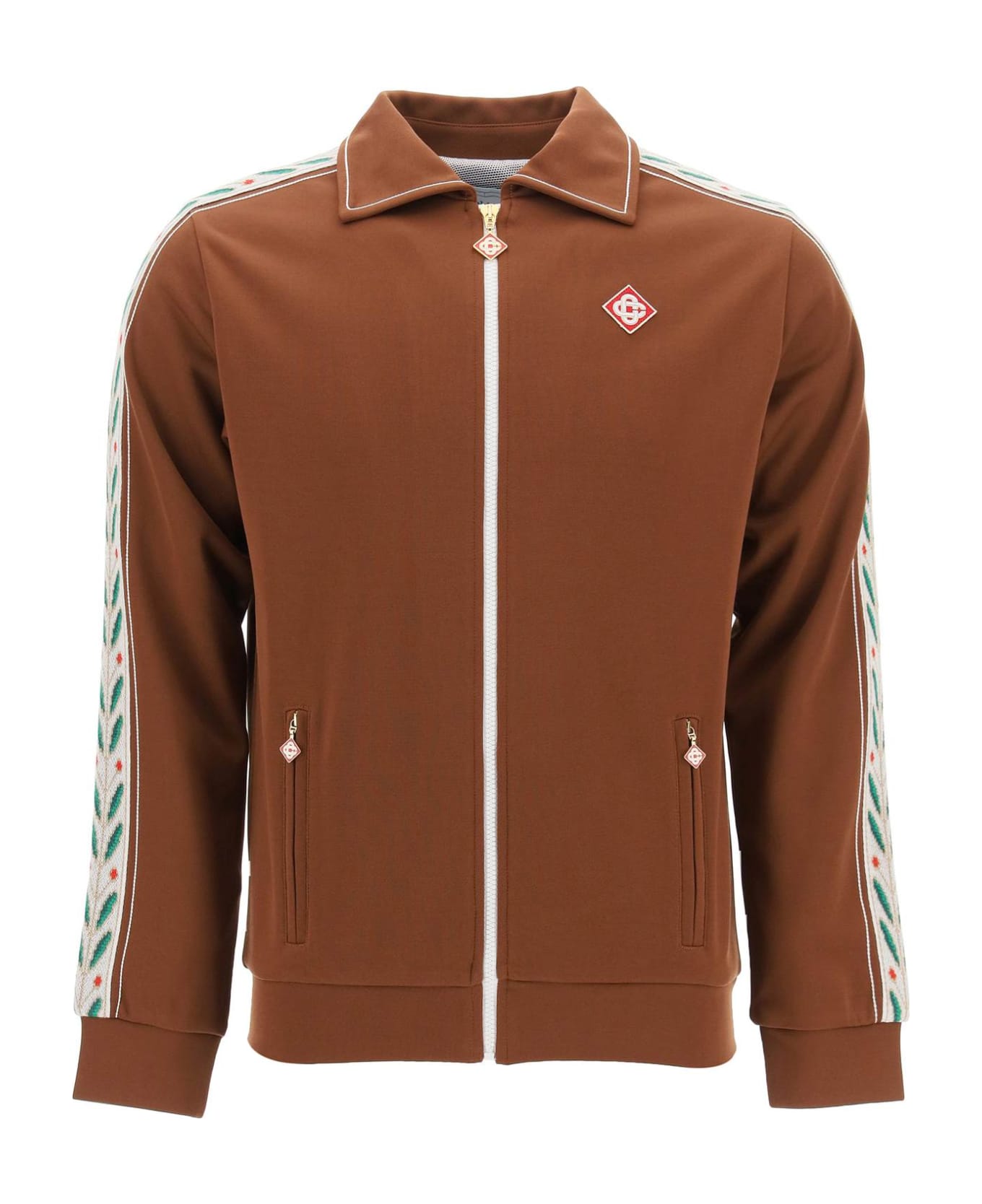 Casablanca sweatshirt crafted in technical cotton interlock jersey with knitted bands decorated with signature Laurel motif along the sleeves. It features spread collar, front zipper fastening with logoed puller, side welt pockets with zipper and embroidered logo patch on the chest. Lined in mesh on the inside. Regular fit. The model is 187 cm tall and wears size L.