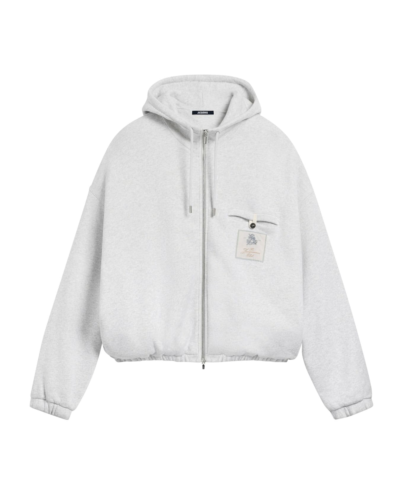 - Jacquemus Club Logo Zip Up Hoodie - Relaxed fit - Mottled cotton fleece - Drawstring hood with circle and square embossed metal tips - Welt pocket with J loop and button - Jacquemus Club logo patch to chest - Double-slider zip fastening - Side seam pockets - Elasticated cuffs and hem - Contrast embroidered textured logo patch to back - Fully lined