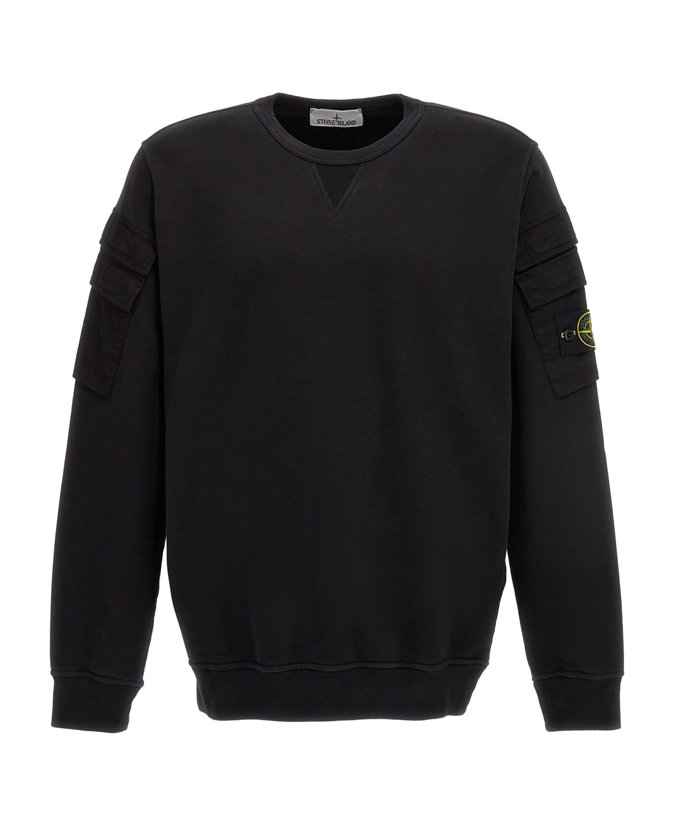 Cotton sweatshirt with pocket application and logo badge on the sleeve, crew neck, long cuffed sleeves. Composition: 100% cotton