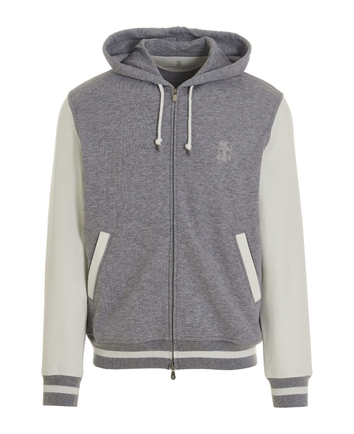 Cotton blend hoodie with front logo embroidery, a zip closure, pockets, and long contrast sleeves with cuffs.