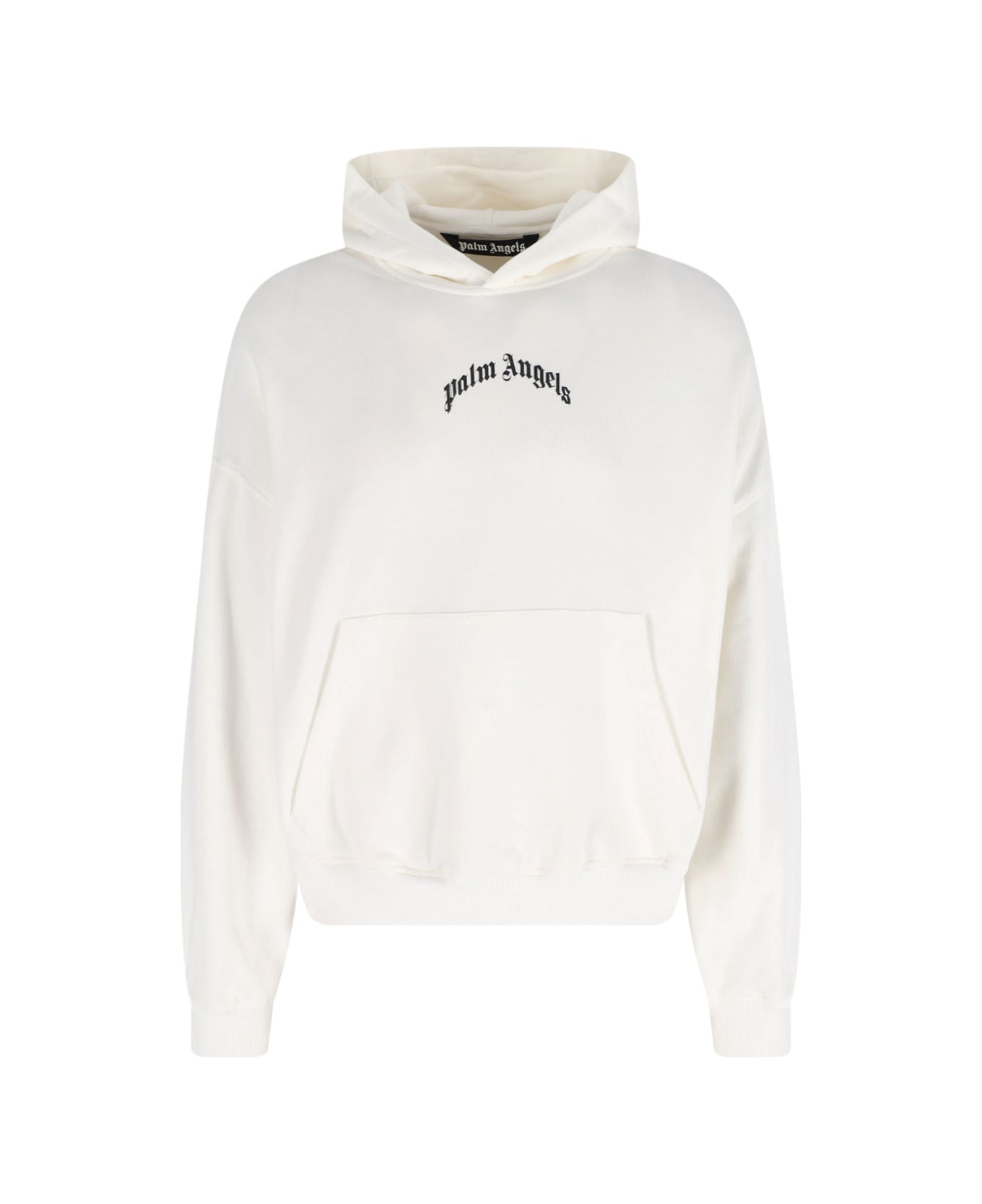 Palm Angels logo hoodie in white cotton with dropped shoulders, contrast logo print on the front, maxi front pocket, contrast logo print on the back, ribbed trim, straight hem. Composition: 100% Cotton