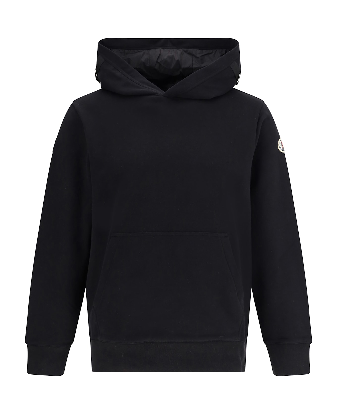 The moncler cotton hoodie is a casual and functional piece. it features an adjustable hood with buckles for a personalized fit. the kangaroo pocket on the front adds practicality, while the ribbed cuffs and hem ensure comfort and a snug fit. the iconic monogram patch on the left sleeve represents the brand's famous logo.