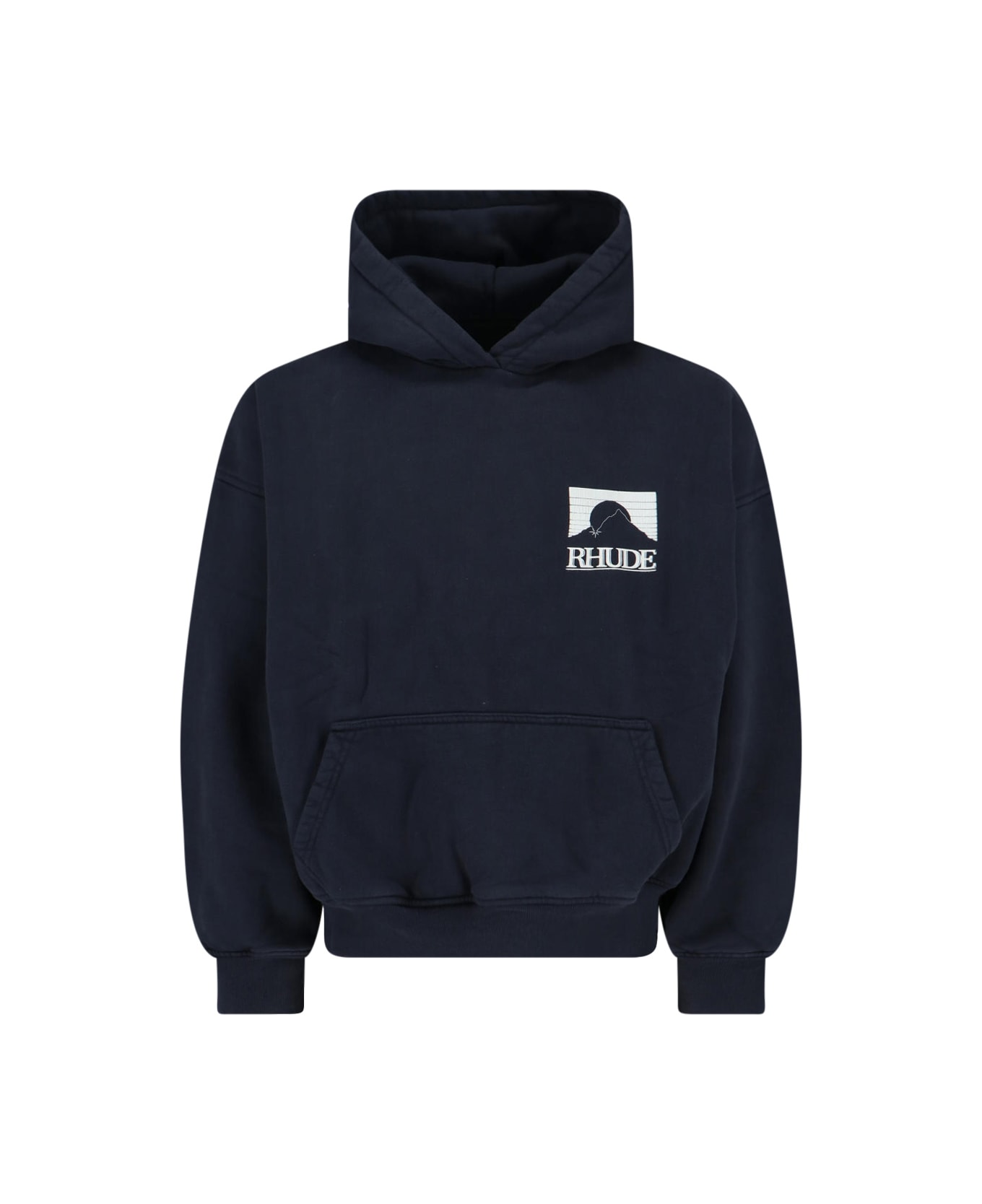 Rhude 'Moonlight' black cotton hoodie with dropped shoulders, contrast logo print on the front, maxi front pocket, maxi logo on the back, ribbed stretch trims, straight hem.
