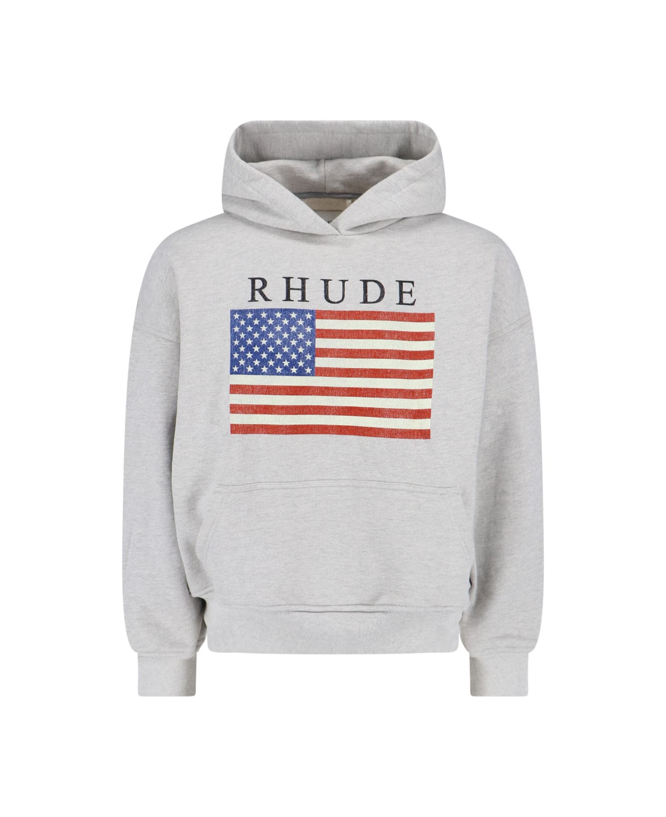 Rhude 'USA' grey cotton hoodie with dropped shoulders, maxi multicolor print on the front, maxi front pocket, ribbed trims, straight hem. Composition: 90% Cotton, 10% Polyester