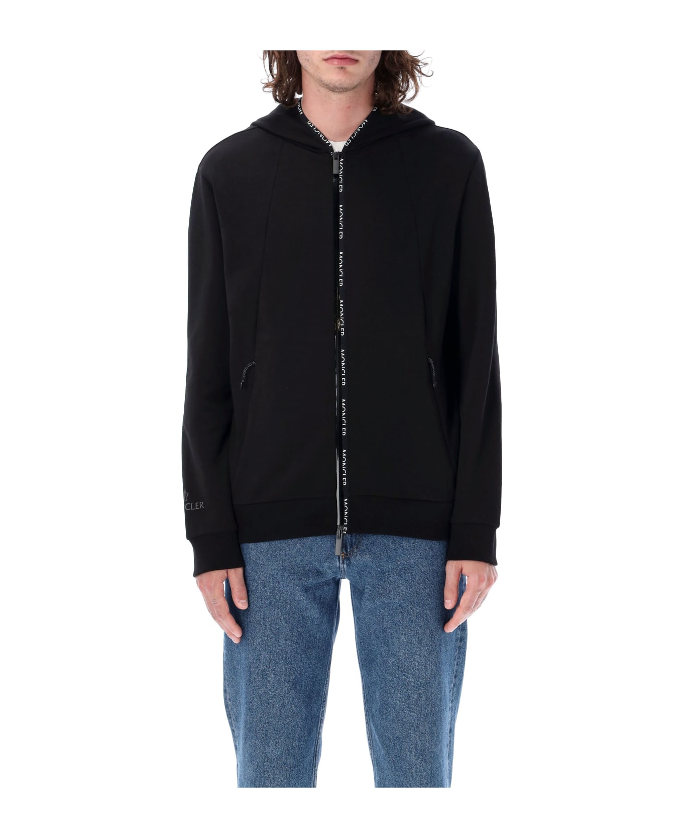 Zip-up Hoodie By Moncler. Featuring: Logo Trim Along The Zip Closure Zip Closure Hood Side Slits Zipped Pockets Silicone Logo On Right Wrist Model Is 1,90 M Tall And He Is Wearing Size L