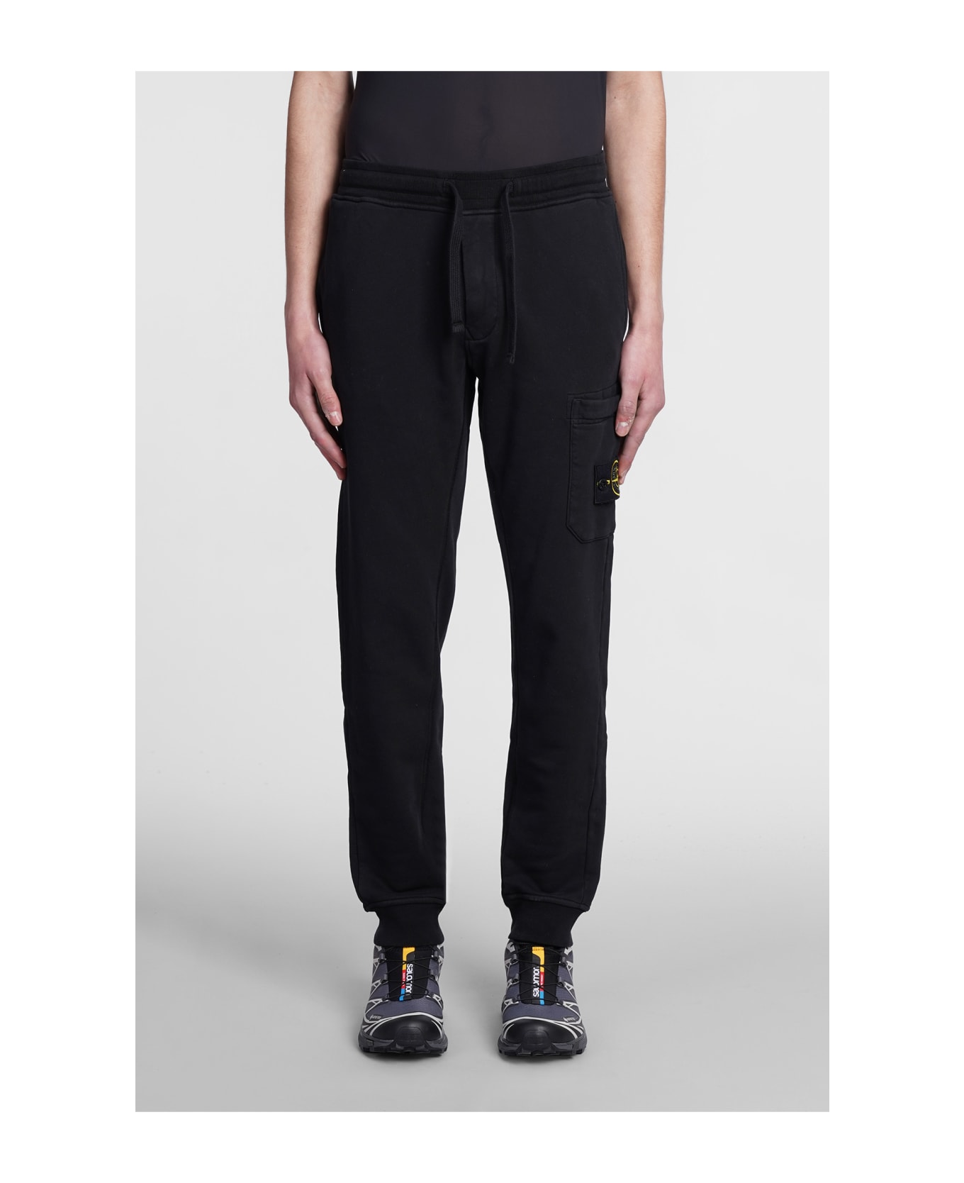 Pants in black cotton, elastic waist, coulisse closure, pockets, side patch logo, 100% cotton, Made in Romania, Model is 1. 83 and wears size M